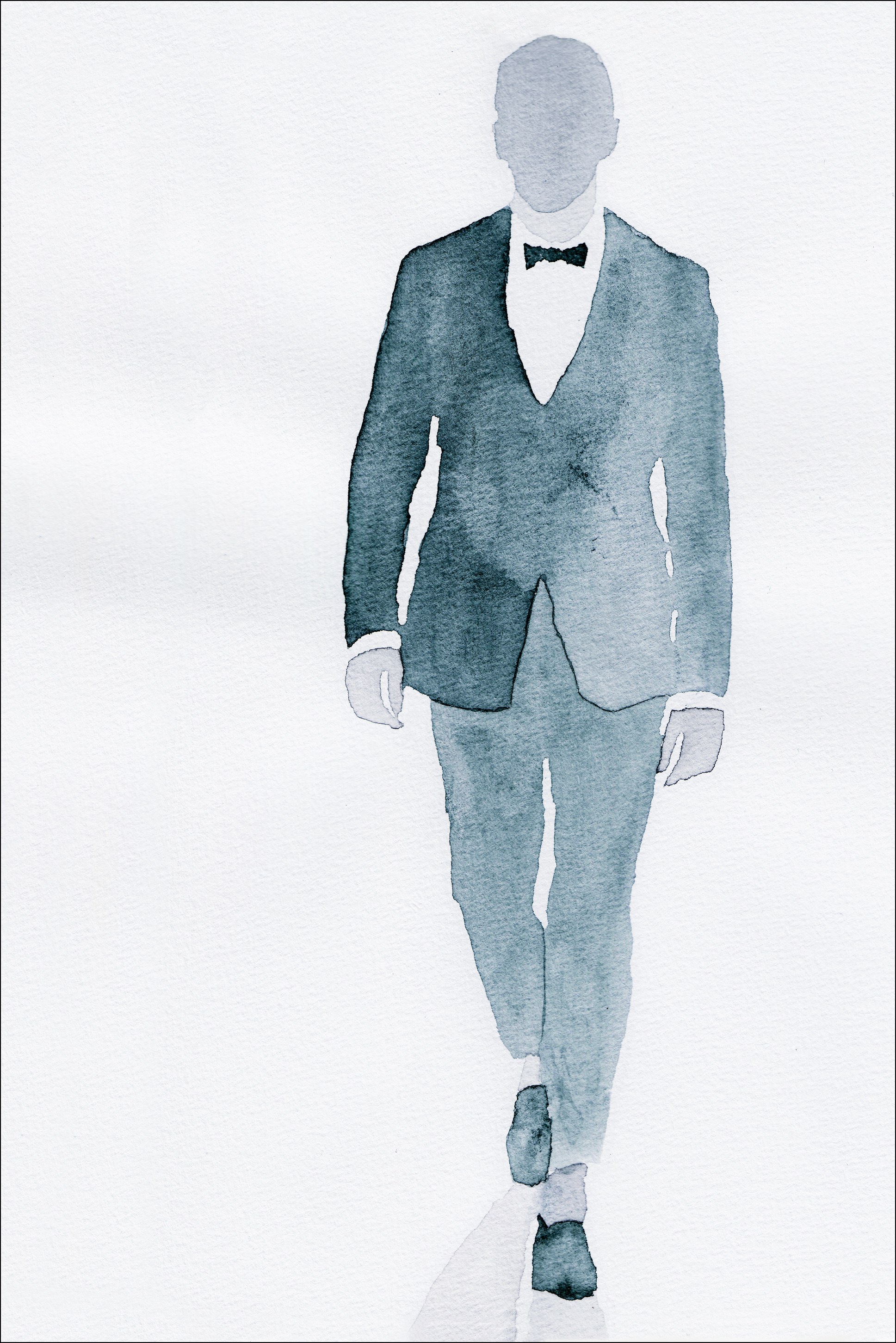 Portrétový poster s mužom v smokingu, ktorý kráča. Jednoduchý, ale stále efektívny, tento modrý obraz ukazuje postavu, ale bez akýchkoľvek detailov. Kto je tajomný muž? To je na vás, aby ste rozhodli, keď si zavesíte obraz doma.
