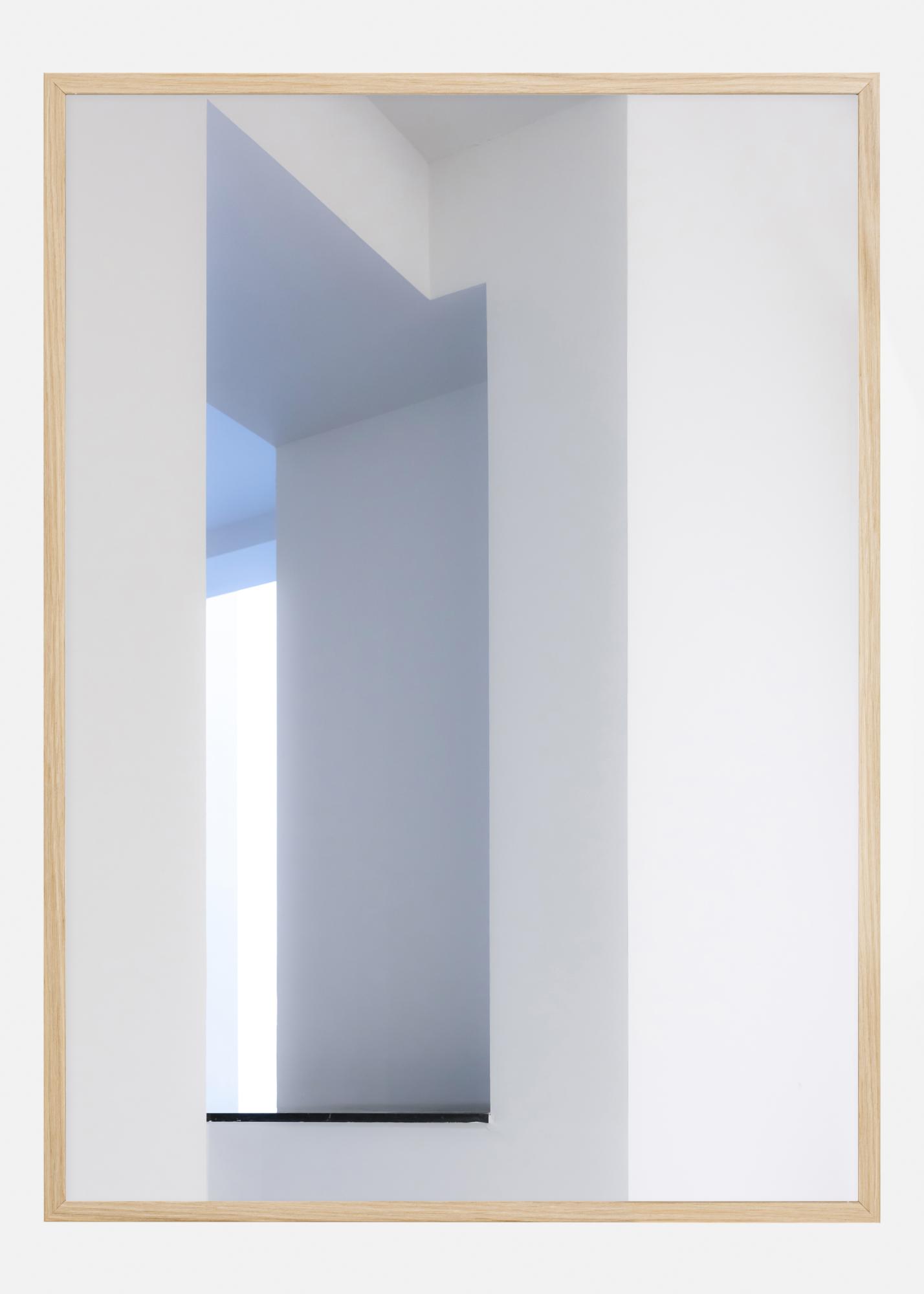 Interiérový plagát so stenami a oknom. Biely a šedý steny a geometrické tvary vedú pohľad k oknu, kde je svetlo biela stena a modrá obloha vonku. Zaveste tento obrázok do trochu tmavšej izby, aby ste získali pocit a ilúziu svetla a priestoru.