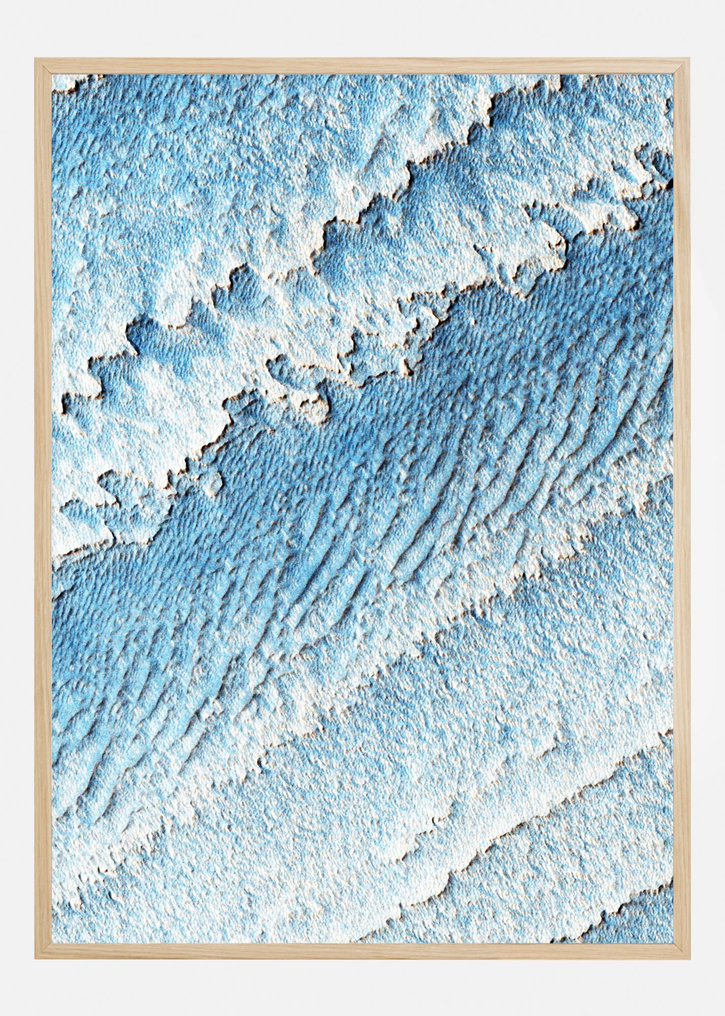 Letecký pohľad na plagát s vlnami, ktoré sa lámu pri pláži. Biele penivé línie v každej vlne, zatiaľ čo voda zvlnená a približuje sa k pevnine. Svetlé modré a azúrové oblasti robia z tohto obrazu odvážny obraz. Skombinujte ho s oranžovou stenou, aby ste dosiahli úplný efekt pomocou týchto doplnkových farieb.