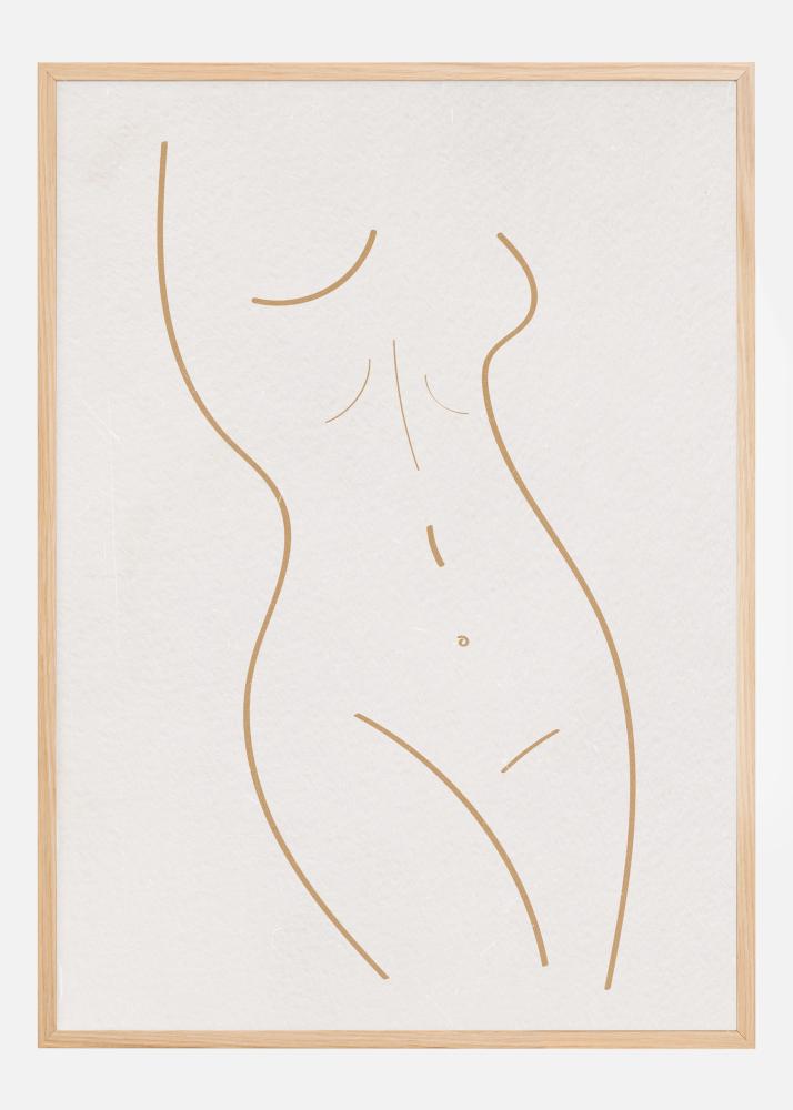 Plagát s kresbou ženy v hnedých líniách. Silné, odvážne hnedé línie obrysujú ženine nohy, brucho a prsia. Línie sú hladké a stúpajúce v tejto elegantnej kresbe. Zaveste toto dielo na jednoduchú bielu stenu pre pocit galerijného umenia.
