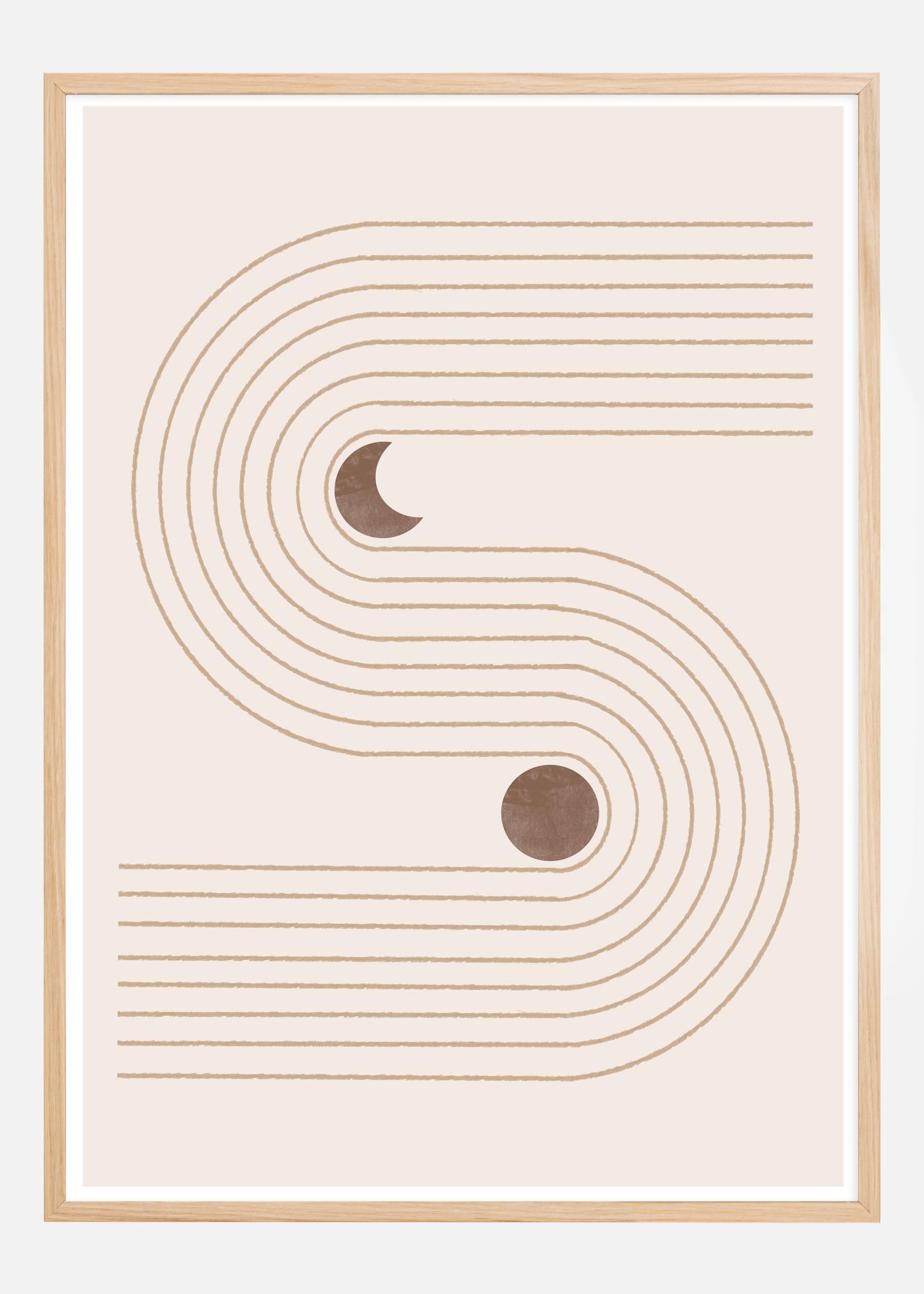 Tento plagát ponúka minimalistickú interpretáciu bohémskych tvarov a nebeských telies so svojimi švihnutými oblúkmi a líniami, ktoré tvoria harmonický vzor. Má upokojujúcu paletu zemitých odtieňov s prvkami tmavohnedých kruhov, ktoré môžu predstavovať mesiace alebo planéty a dodávajú dizajnu kozmický nádych. Oblúky prinášajú pocit pohybu a plynutia, zatiaľ čo okrúhle tvary prispievajú k prvku rovnováhy a symetrie.