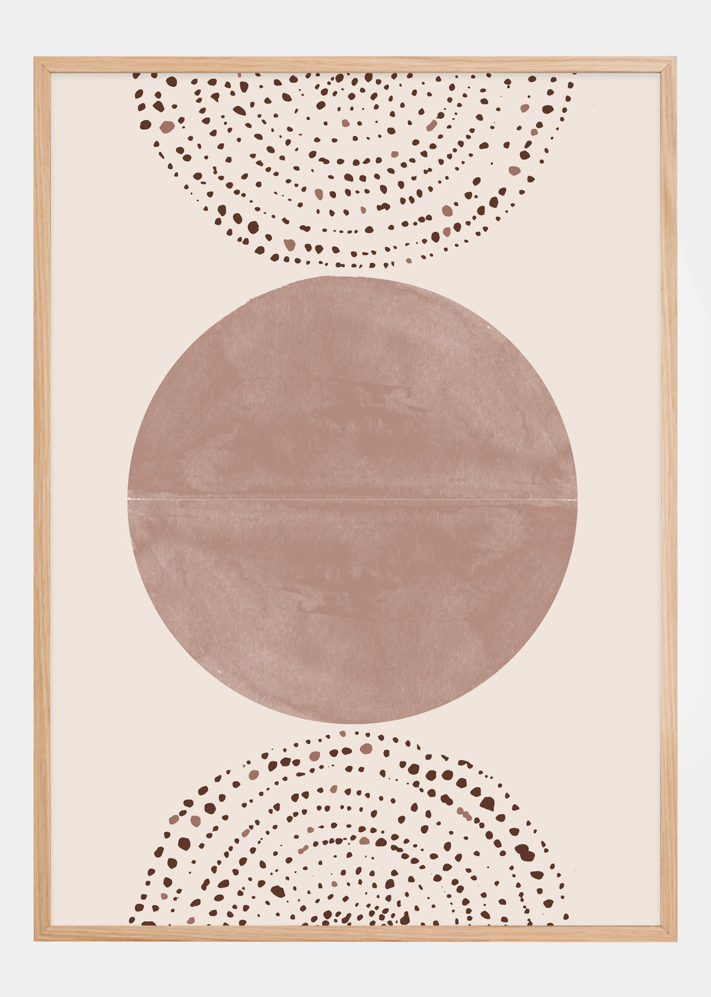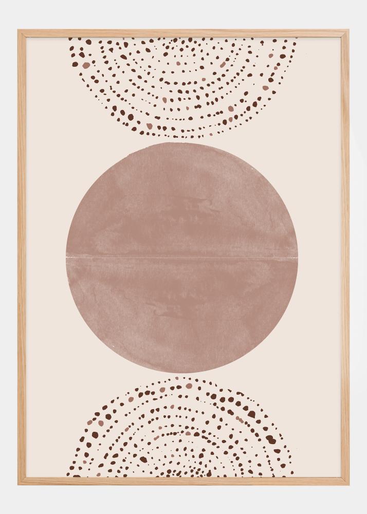 Tento sofistikovaný a upokojujúci plagát zdôrazňuje veľký, jemný, terakotovo zafarbený kruh ako stredobod v kompozícii jemných, rozptýlených bodiek, ktoré tvoria splývavé polkruhy nad a pod. Tento motív je inšpirovaný bohémskym dizajnom a prináša uvoľnený, zemitý pocit zároveň so súčasným nádychom do miestnosti, ktorú zdobí.