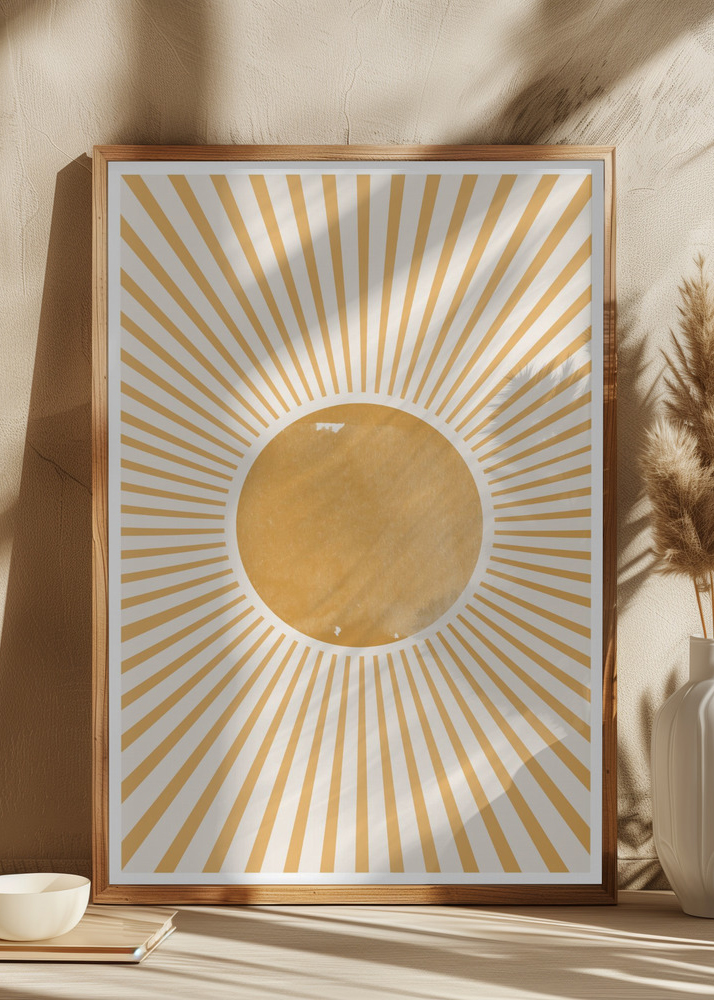 Tlač dokáže rozjasniť každú miestnosť a priniesť nádych boho-chic do vášho interiéru. Je ideálna pre tých, ktorí chcú vniesť trochu prírody a pocit svetla do svojho domova. Jej univerzálny symbol slnka z nej robí vítaný doplnok v rôznych interiéroch, od obývačky po jogové priestory alebo detské izby.
