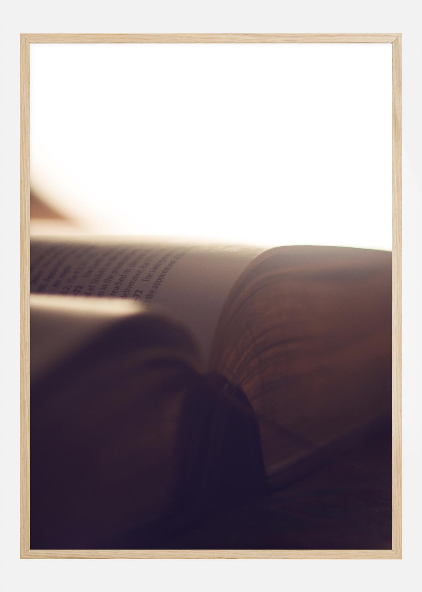 Detailný plagát s otvorenou knihou. Bielé svetlo vypĺňa väčšinu tohto obrázka, pretože svieti na knihu so zlatými okrajmi strán. Slová sú ledva viditeľné, čo robí tento výtlačok dokonalým pre študovňu.