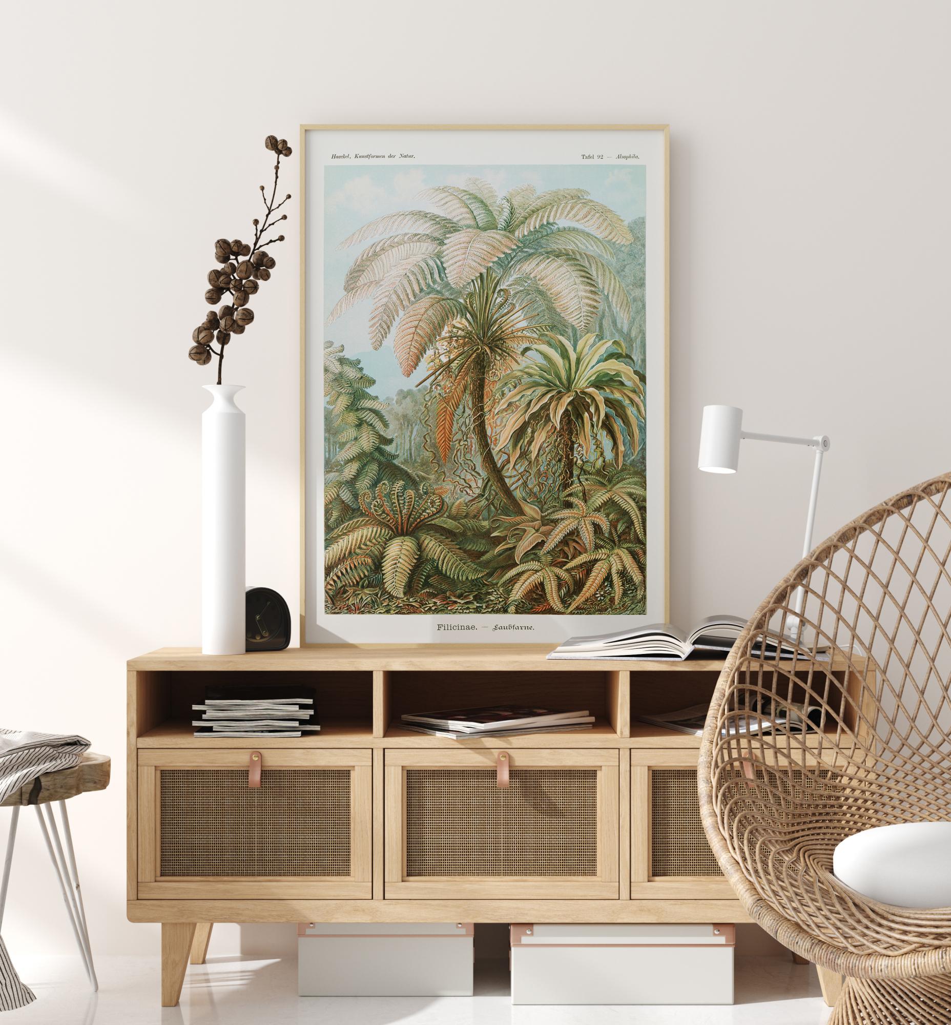 Ilustrovaný botanický plagát s rôznymi rastlinami. Veľké palmové listy a paprade pokrývajú celý tento obraz. Zelená, modrá a oranžová vytvárajú jemné tóny v tejto starožitnej nemeckej vedeckej kresbe. Dodajte svojmu domu nádych histórie s týmito rastlinami a ich latinskými názvami.