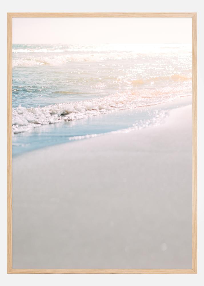 Detailný plagát s vlnami narážajúcimi na hladkú piesočnatú pláž, zatiaľ čo biele svetlo, ktoré sa leskne na hladine vody v skoré ráno, vytvára magický pocit. Jemné modré, ružové a žlté odtiene robia z tohto diela dokonalý doplnok do spálne.
