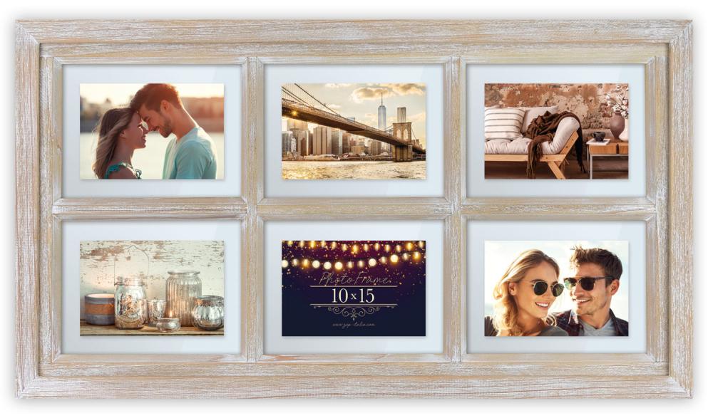 Horizontálny kolážový rámik v svetlom dreve. Toto je rám, ktorý pojme 6 fotografií vo veľkosti 10x15 cm a umožňuje vám jednoducho usporiadať skupinu obrázkov spolu spôsobom. Rám má trochu drevených detailov, ktoré mu dodávajú rustikálny, ale zároveň vidiecky charakter. Vonkajšie rozmery rámu sú 38,5x69,5 cm. Nástenný držiak je k dispozícii.
