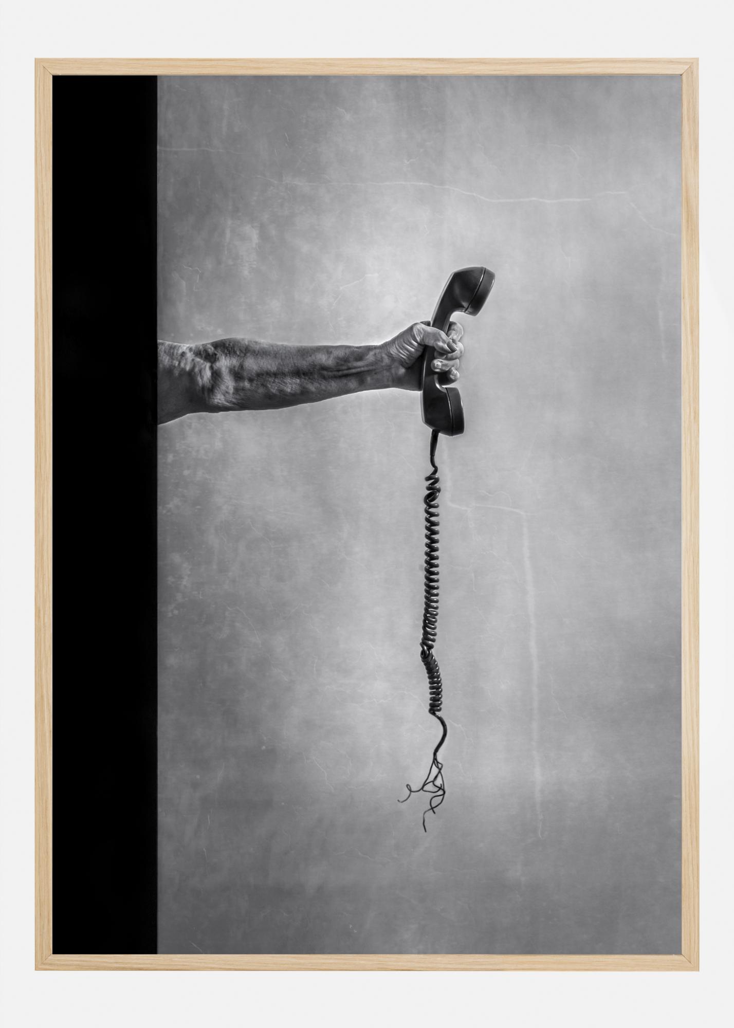 Čiernobiely plagát s rukou, ktorá drží telefónnu slúchadlo s prerušeným káblom. Silná ruka drží telefón v strede obrazu. Čierny telefón a kábel visia dole na šedom pozadí. Komu sa ten telefón podáva? Oddýchnite si a užite si tento obraz, keď visí vo vašom domove.