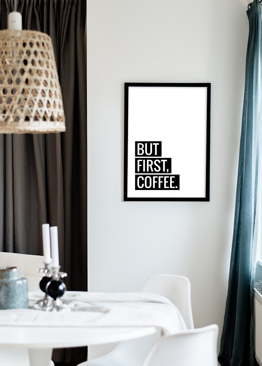 Precestuj svet, začni vlastný podnik, nauč sa žonglovať zároveň, kým balancuješ na supertenkej línii! Ale najprv – káva. Tento štýlový plagát sa hodí pre teba, kto považuje tento úžasný nápoj za dôležitú súčasť každodenného života. Zaveste ho nad kuchynský stôl alebo v kancelárii! Plagát je biely s textom ”But first, coffee” na čiernom pozadí. Čierno-biely dizajn funguje výborne spolu s rámčekom alebo paspartou v zaujímavej farbe. Vyberte si z 6 rôznych formátov.