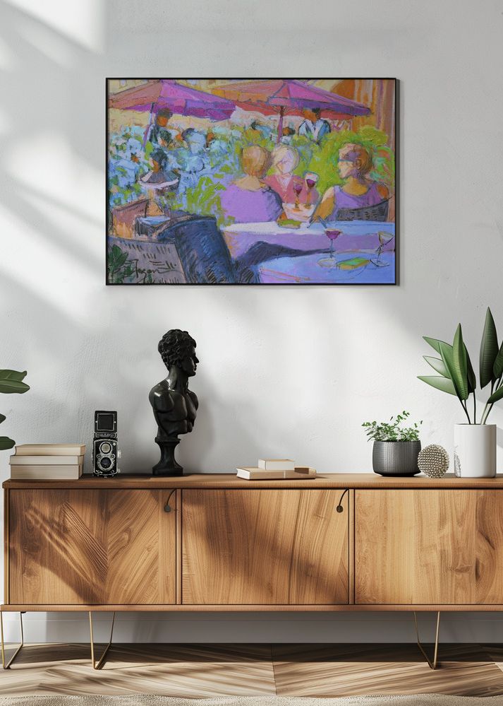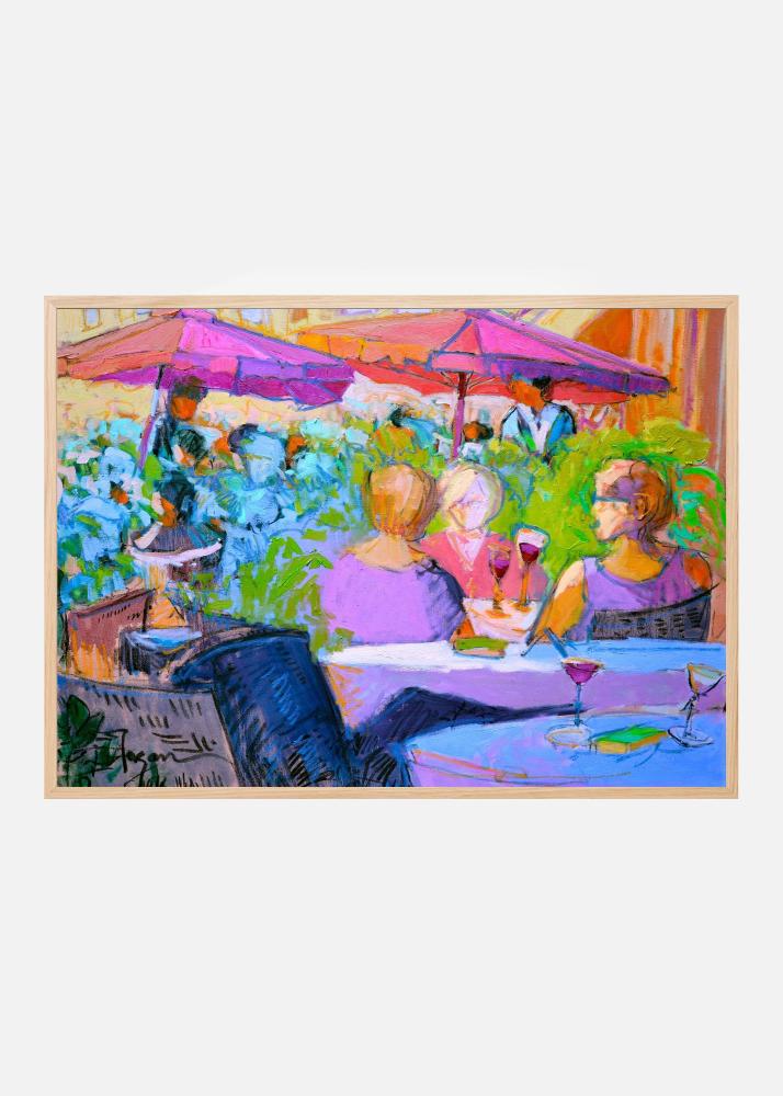 Tento farebný plagát zachytáva živú vonkajšiu kaviareň so zameraním na troch ľudí obklopených letnou zeleňou. Motív pozýva k pocitu spolupatričnosti a uvoľnenej atmosféry, ideálny na to, aby tvoj domov získal nádych mestskej letnej idyly. Tento print je skvelou voľbou pre každého, kto miluje mať doma živé a energizujúce obrázky.