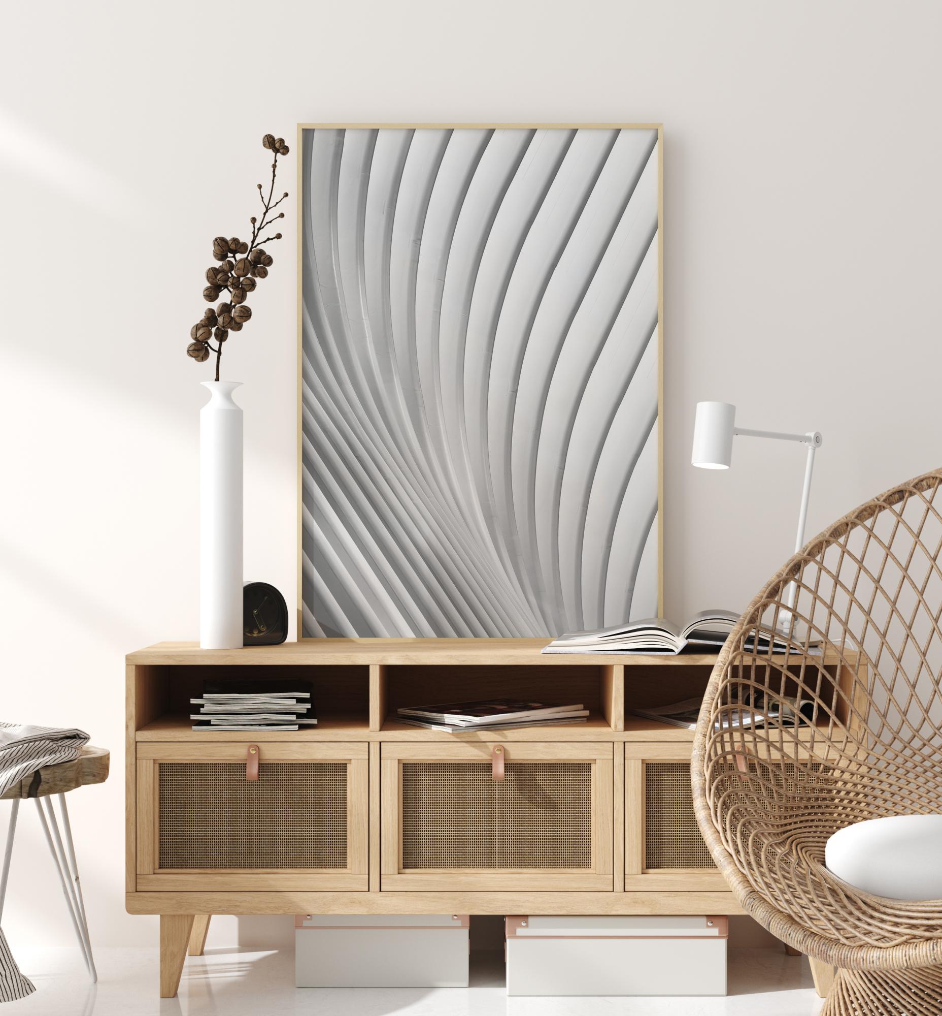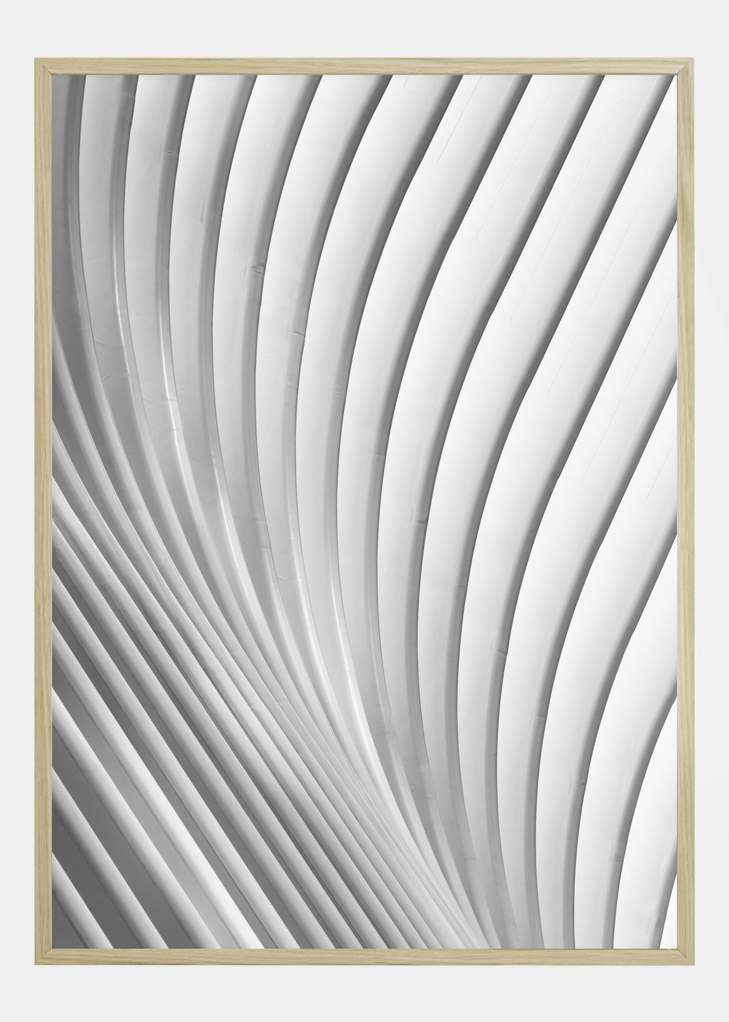 Abstraktný plagát s vlnitými bielymi a sivými čiarami cez obraz. Čiary začínajú v pravom dolnom rohu a jemne sa ohýbajú nahor, kým sa neotočia doprava. Aj keď je jednoduchý, tento obraz priťahuje pozornosť, keď necháte svoje oči uvoľniť sa a sledovať čiary.