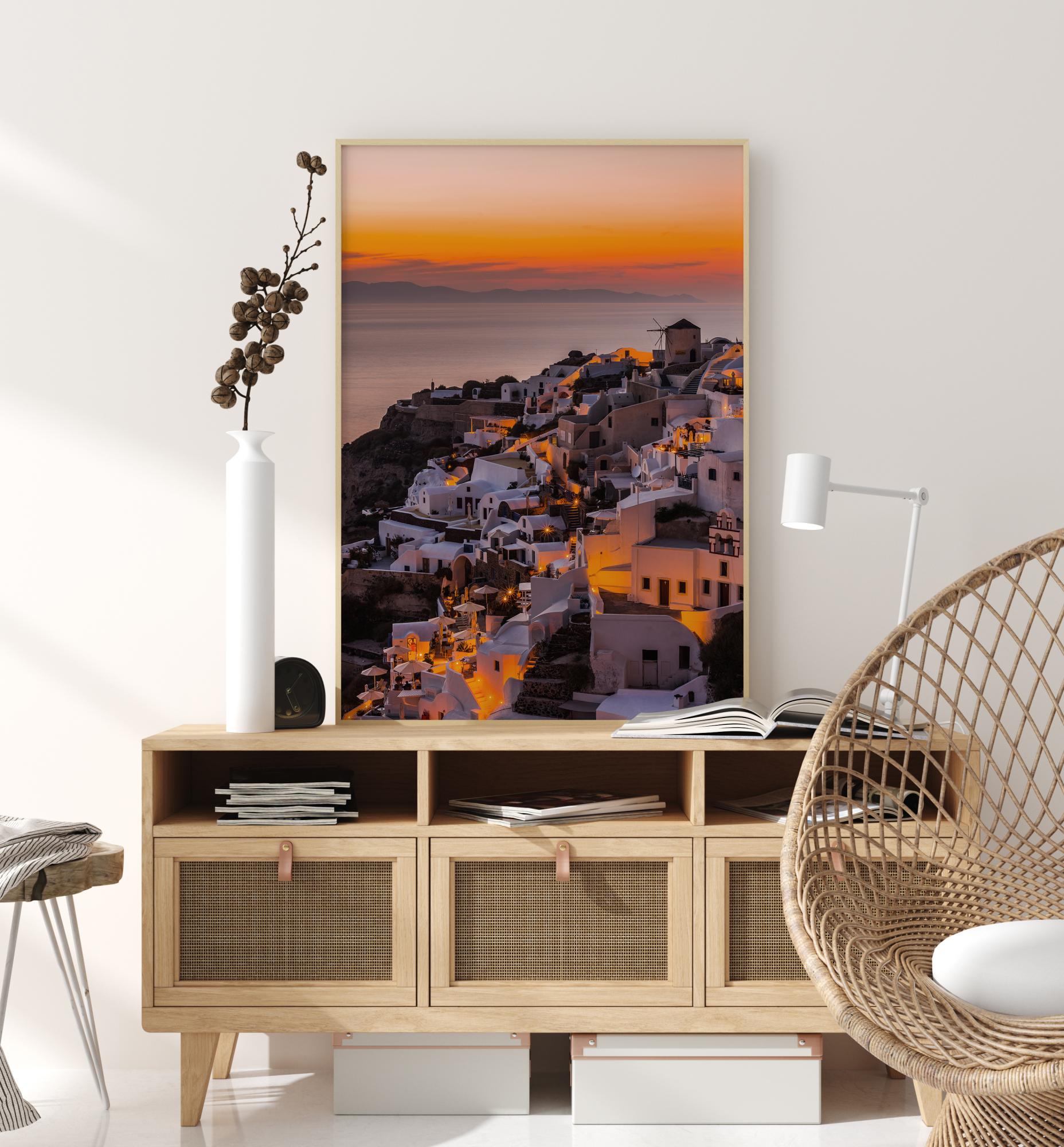 Scénický plagát s Calisera Santorini pri západe slnka. Malé mesto jemne svieti v pouličnom osvetlení. Biele domy vynikajú s jemným, hmlistým morom a horami v pozadí s živou oblohou pri západe slnka. Odíďte bez toho, aby ste opustili domov, pri pohľade na tento plagát.