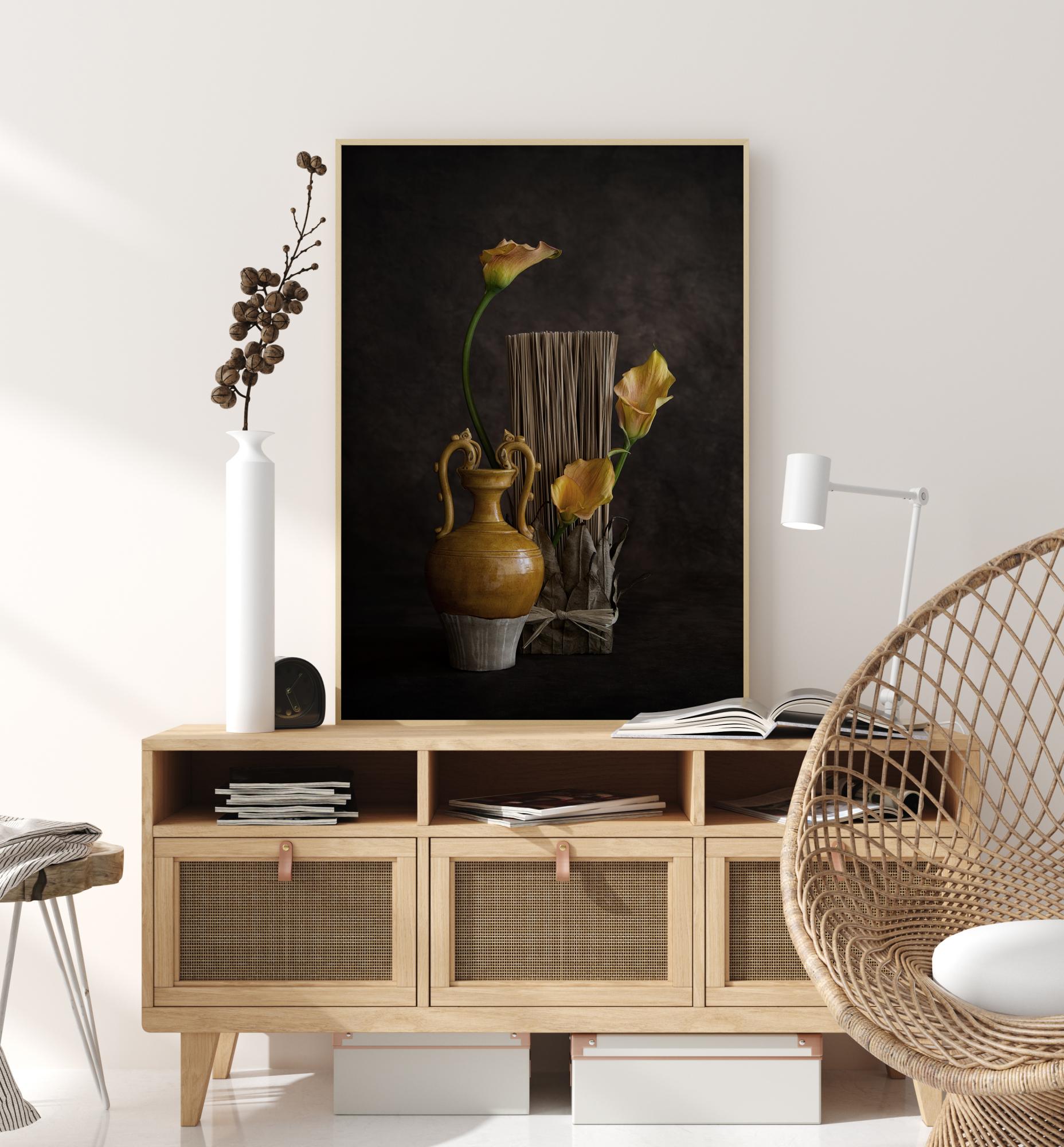 Stillebenový plagát s kanvicou, sušenými hnedými stonkami a troma ľaliovými kvetmi. Čierne pozadie spôsobuje, že horčicová kanvica a tri žlté ľalie výrazne vynikajú. Jedna ľalia sa ohýba nahor smerom k vrcholu a priťahuje pohľad okolo diela. Zaveste to doma, aby ste priniesli nádych elegancie.