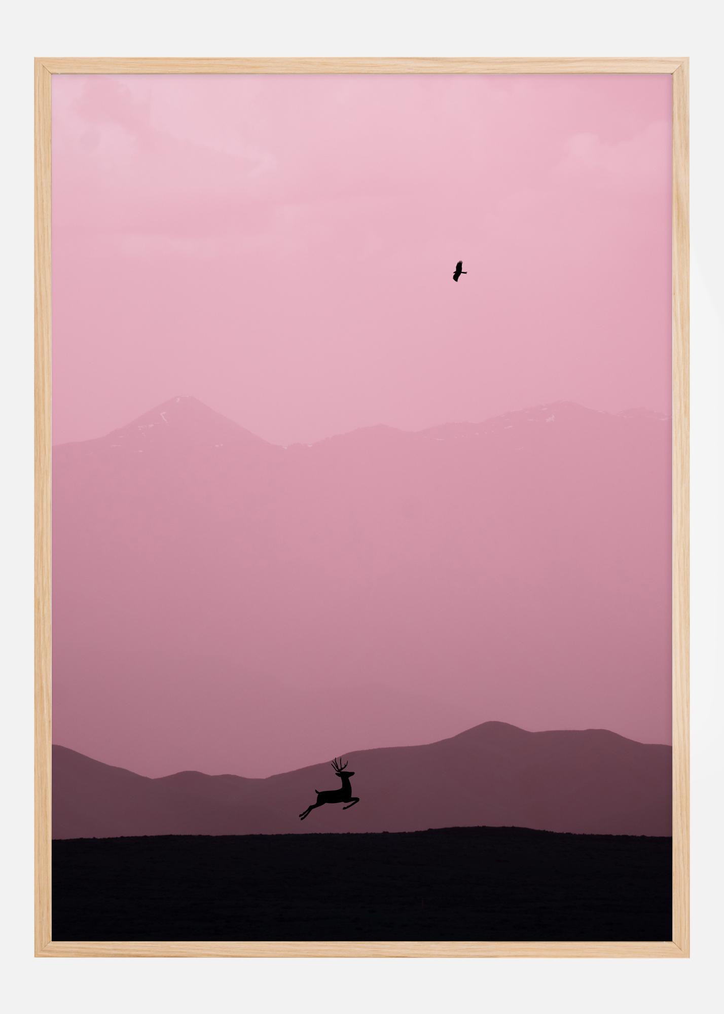 Tento pokojný a snový plagát zachytáva podstatu slobody a krásy prírody. Silueta jeleňa chyteného v skoku nad siluetou jemne zvlnených kopcov vytvára pocit pohybu a ľahkosti. Nad tým všetkým sa rozprestiera jemne ružová obloha, ktorá pridáva pocit tepla a zázraku. Osamelý vták letí smerom k nekonečnosti oblohy, čím pridáva ďalší rozmer slobody a neviazanosti do obrazu.