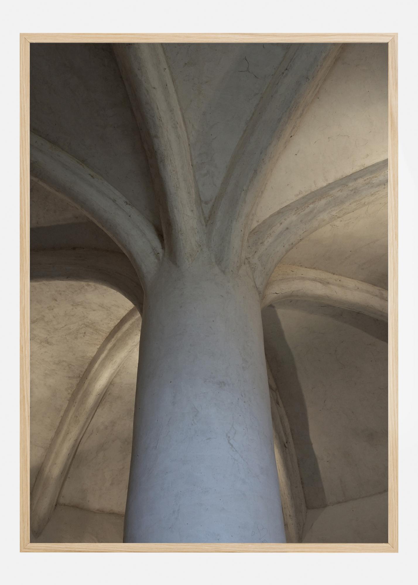 Architektonický plagát s vnútorným pohľadom na kaplnku alebo kostolný strop. Uprostred stojí jediný stĺp, ktorý sa dotýka stropu a z ktorého sa ako kvet rozprestiera osem oblúkov. Chladný kameň vytvára pocit veľkoleposti, ktorú si môžete vychutnať z pohodlia domova.