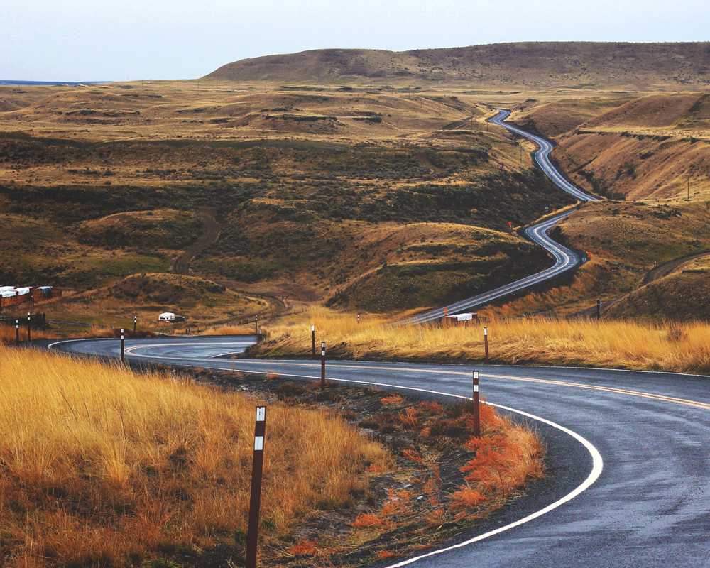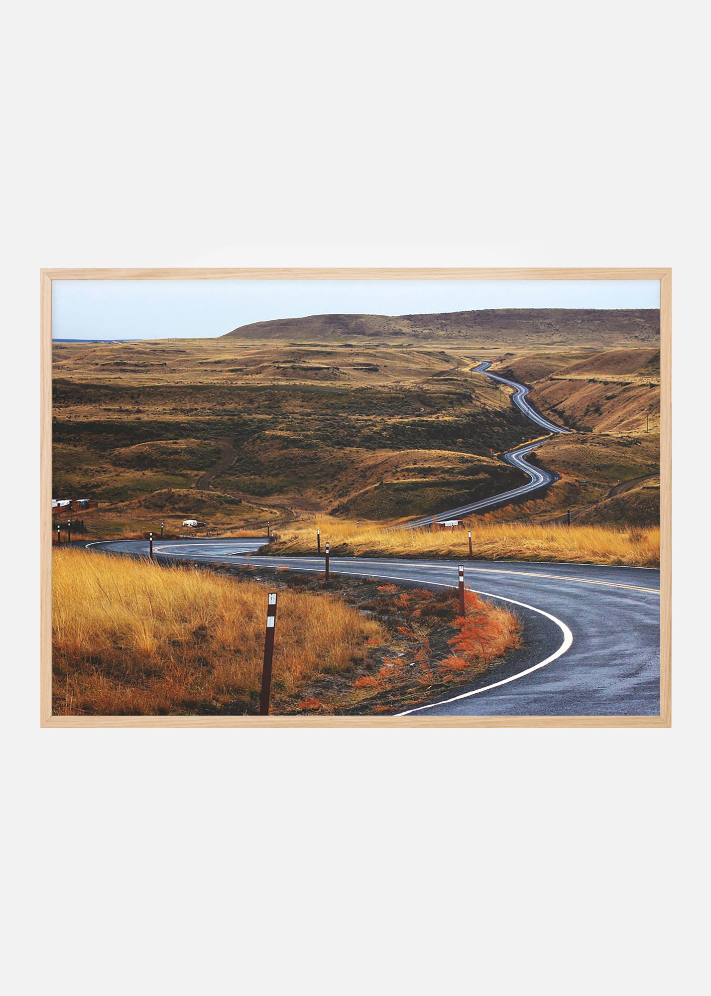 Plagát s asfaltovou cestou, ktorá sa kľukatí cez slnkom vyprahnutú stepnú krajinu. Žltohnedé odtiene trávy proti studenej ploche asfaltu, ktoré sa lámu cez otvorenú krajinu, priťahujú pohľad do obrazu a nasledujú cestu. Plagát dobre vyzerá v minimalistickom ráme, kde motív vynikne a môže byť ľahko kombinovaný s inými obrazmi do témy.
