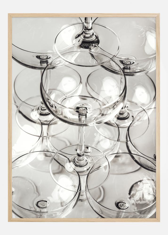 Tento elegantný a sofistikovaný plagát zachytáva krásu a jasnosť kaskády pohárov na šampanské. Obrázok zobrazuje detailný pohľad na dômyselnú štruktúru skla, kde sa svetlo odráža a láme cez priehľadný materiál, čím vytvára tanec svetla a tieňov. Bohatstvo detailov a jemná presnosť kompozície zdôrazňujú jemné tvary pohárov a jemné odtiene skla.