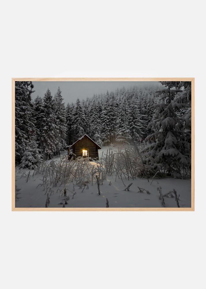 Plagát s roztomilou malou drevenou chatkou v zimnom šate, hlboko v smrekovom lese. Svetlo z okna, ktoré osvetľuje mrazivú zimnú noc, dodáva fotografii hĺbku a robí obraz zaujímavým. Obrázok sa hodí do všetkých štýlov interiérov a prostredí. Rovnako dobre sa hodí v tenkom čiernom kovovom ráme ako aj v robustnejšej variante z dreva, alebo prečo nevyužiť svetlo na obrázku v klasickom zlatom ráme.
