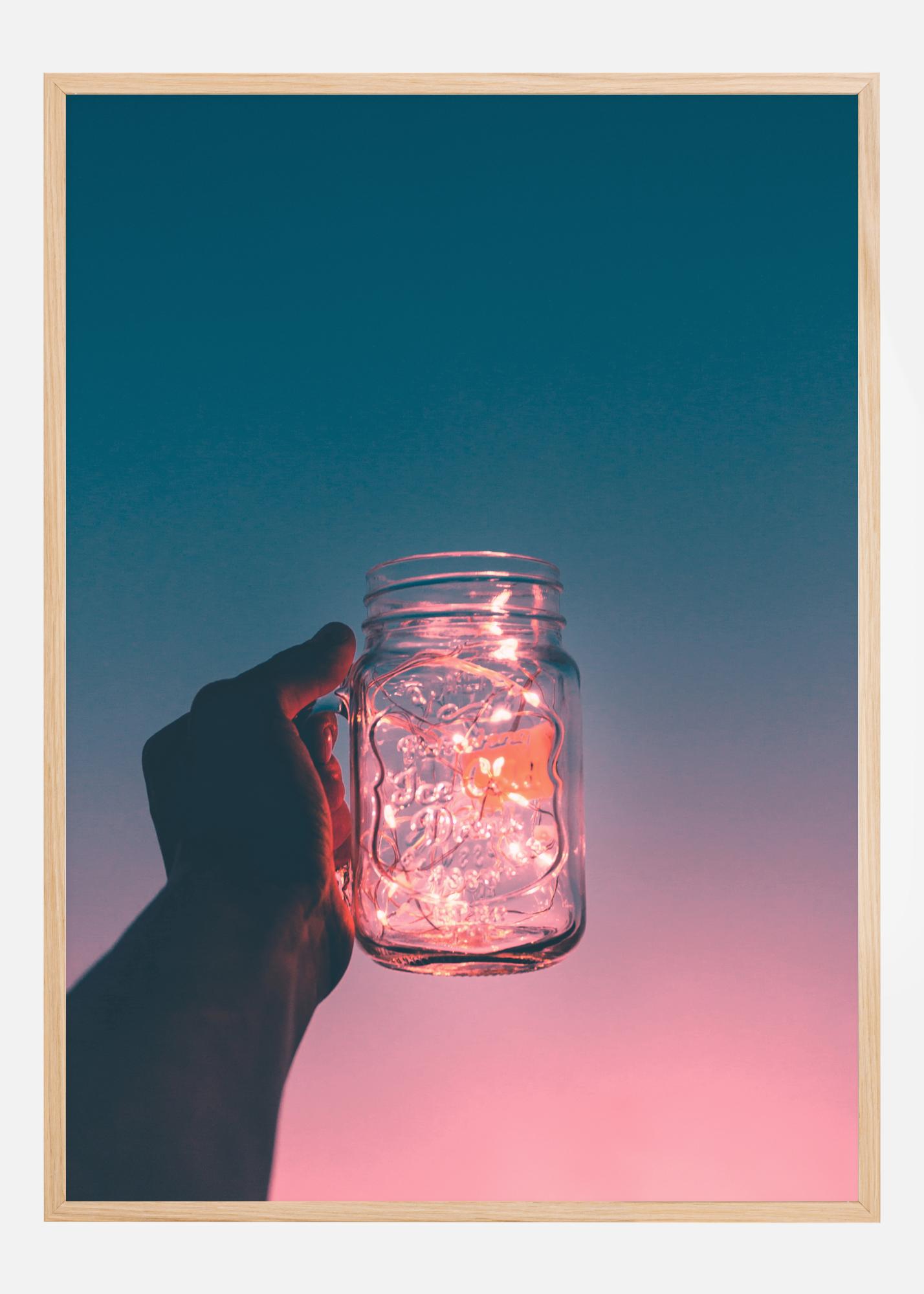 Pekný plagát s rukou držiacou sklenený hrnček s LED svetlom. Užívajte si magickú atmosféru mäkkej modrej a ružovej pozadie, ktoré dodáva dielu skutočný pocit fantázie. Pozdvihnite svoj pohár k tomuto obrazu a pocíťte povznášajúci pocit, ktorý tento plagát prináša.