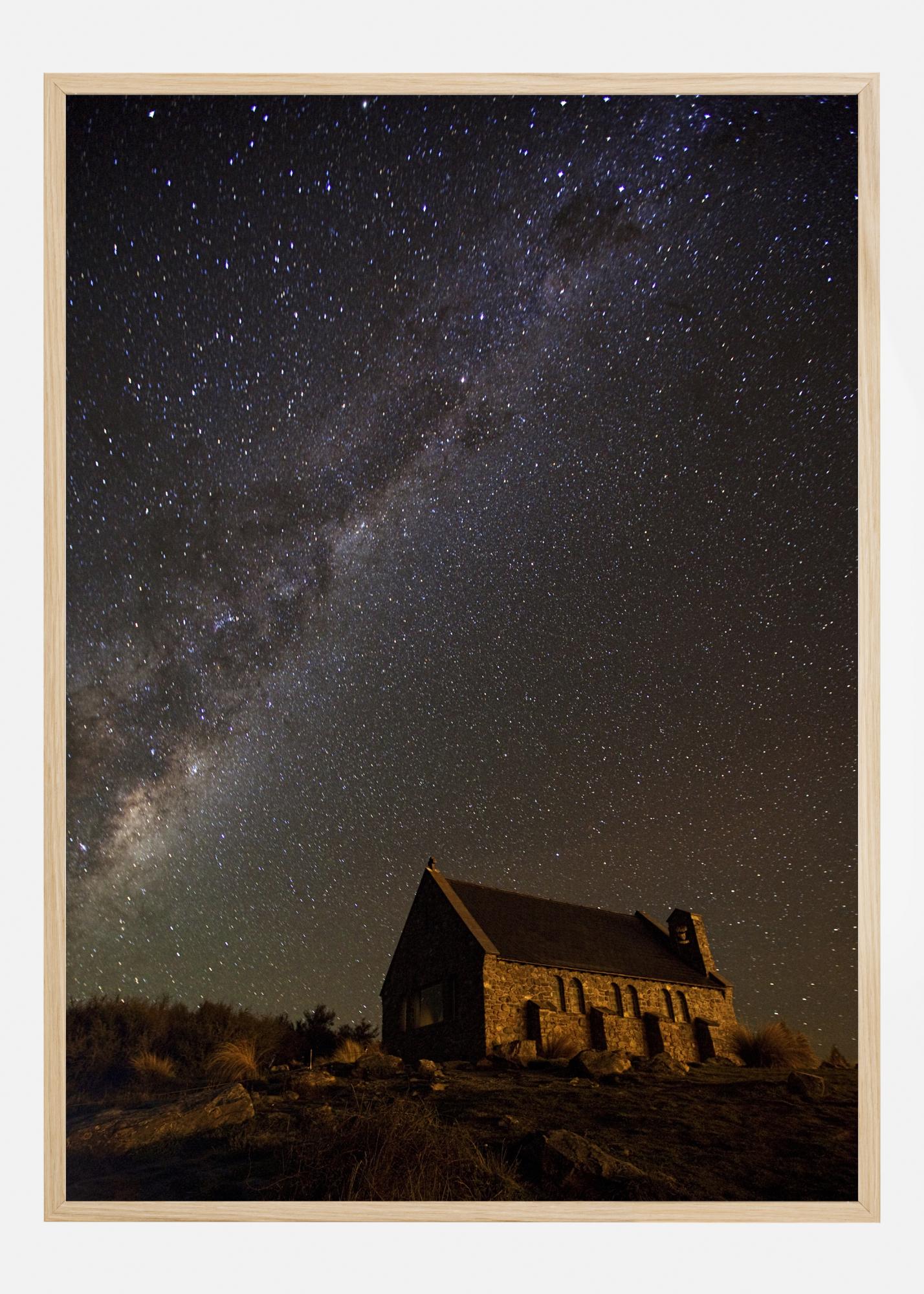 Náboženský plagát starého kamenného kostola s Mliečnou cestou v pozadí. Rustikálny kostol je osvetlený mäkkým svetlom na kopci. Svetlá nočná obloha je plná malých hviezd, ktoré tvoria našu galaxiu nad ním. Pociťujte úctu k nášmu vesmíru na tomto obrázku.