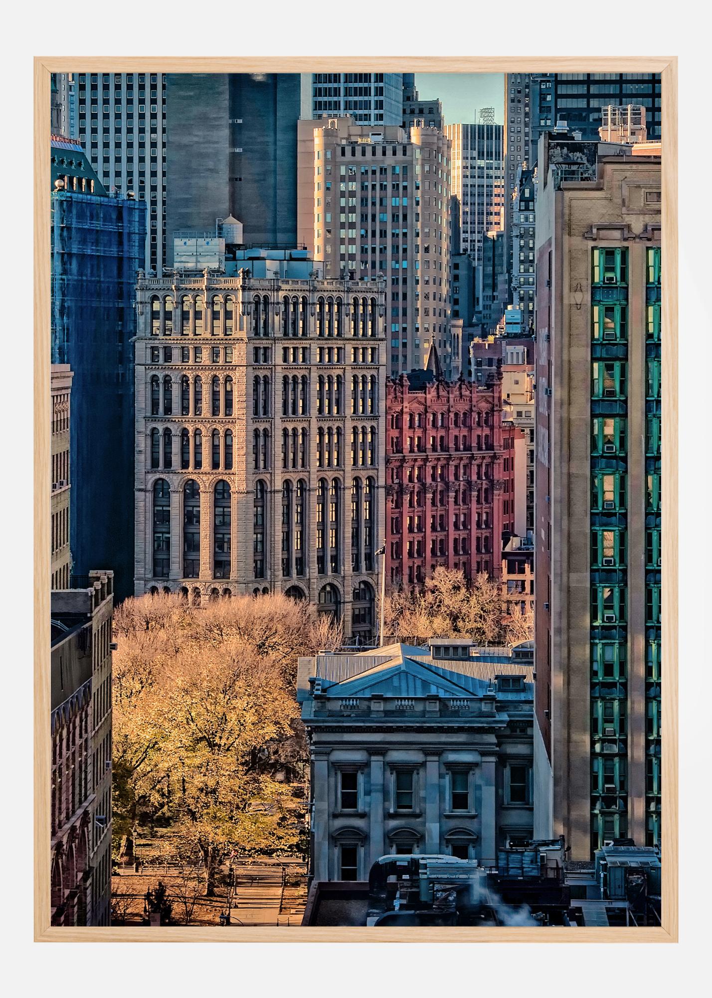 Mestská krajinná fotografia so starými a novými budovami. Jesenné stromy a červené tehlové budovy kontrastujú úžasným spôsobom s chladnejšími modrými mrakodrapmi. Predstavte si, že pozeráte z okna na toto rušné mestské miesto, keď máte tento obraz vo svojom domove.