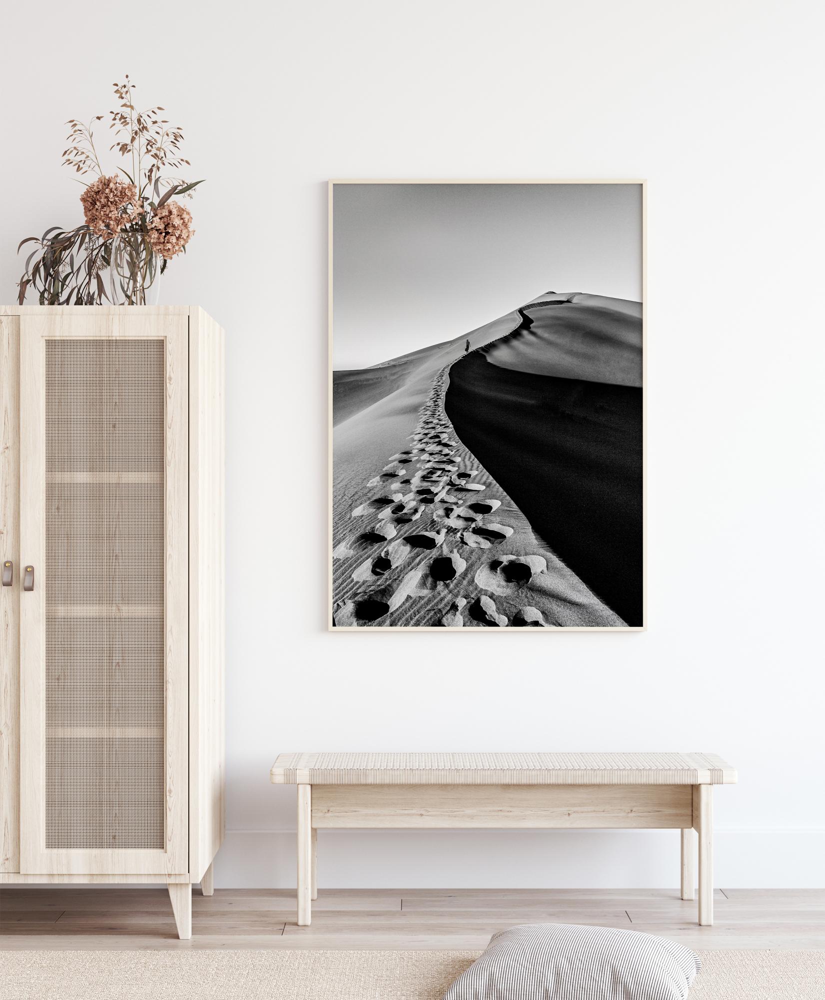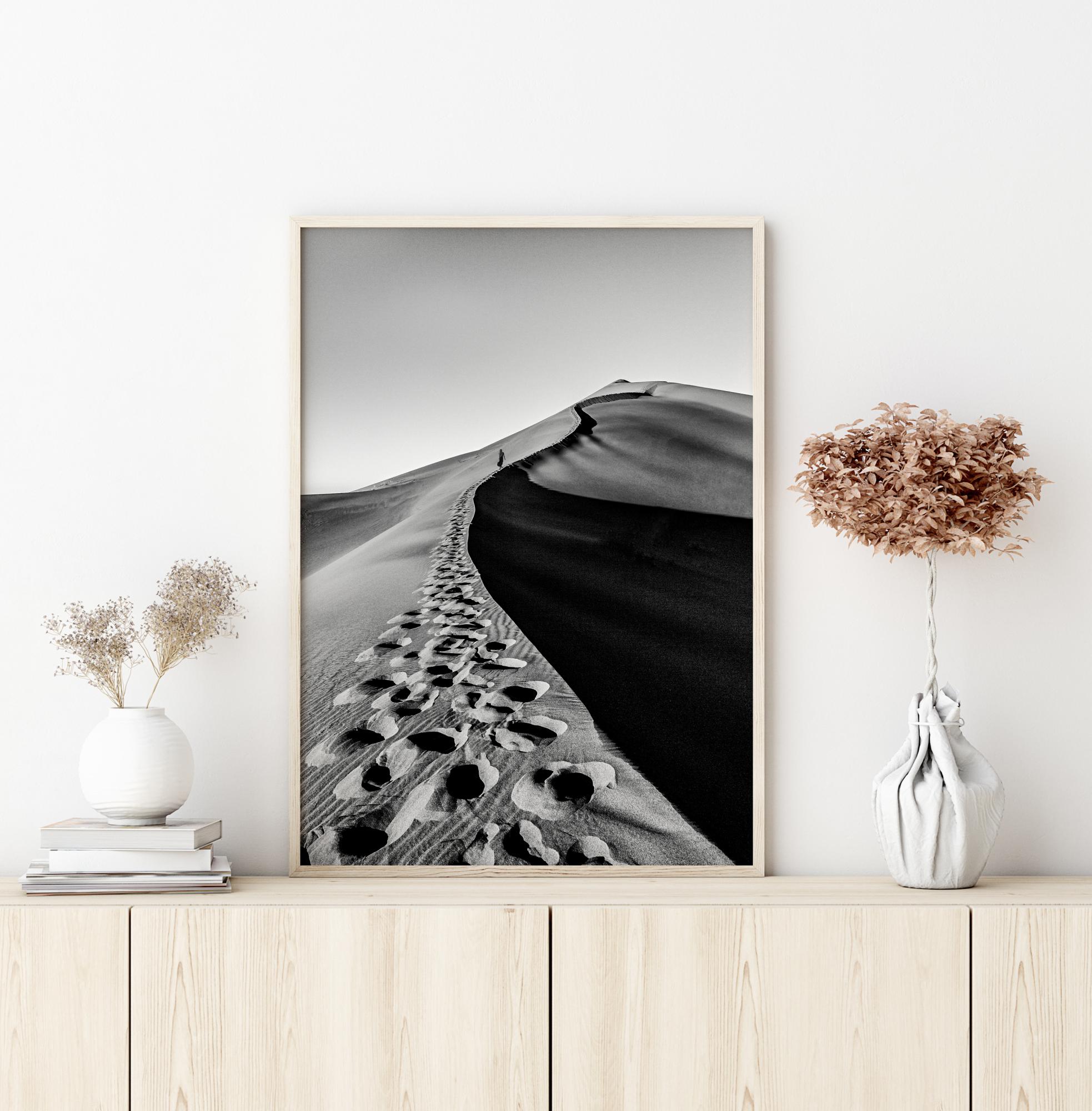 Úžasný plagát osoby, ktorá lezie po piesočnej dune. Fantastická čierna stopa kontrastuje so stopami v piesku, čím vedie oči k vzdialenej postave. Tento obraz prináša doma pocit dobrodružstva.