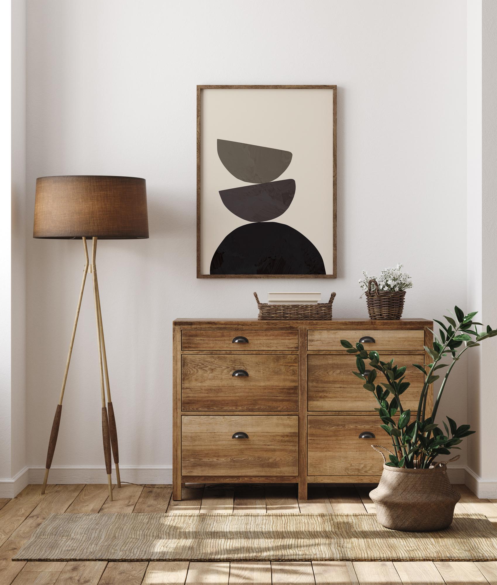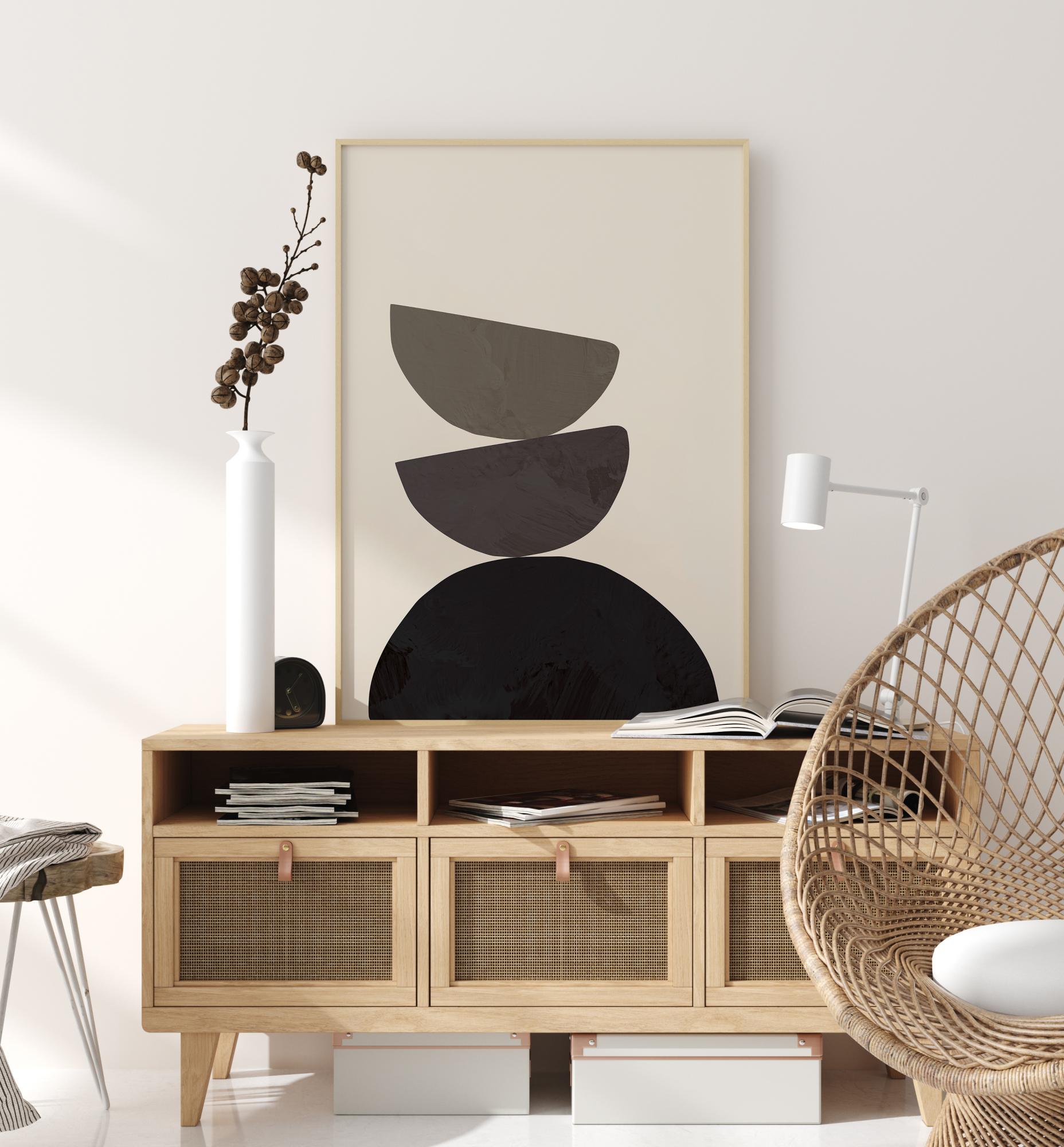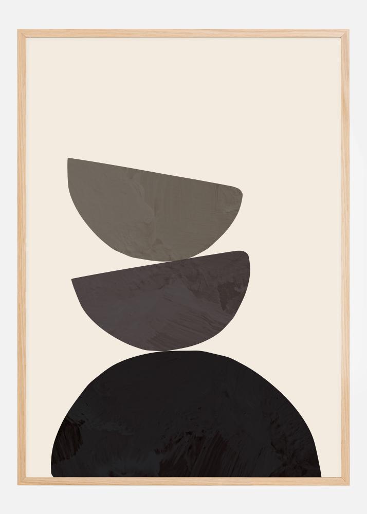 Plagát s tromi naskladanými polkruhmi, ktoré sa navzájom vyvažujú. Na spodku je čierny polkruh s dvomi obrátenými polkruhmi v rôznych odtieňoch sivej. Užívajte si dokonale vyvážené tvary, keď si tento obraz zavesíte na svetlo sfarbenú stenu.