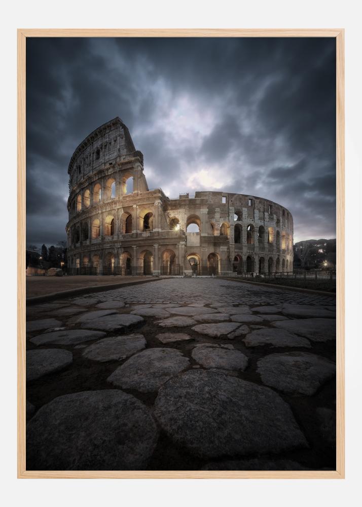 Tento dramatický plagát zachytáva podstatu histórie s pôsobivým obrazom Kolosea v Ríme pod intenzívne zamračenou oblohou. Hlboké sivé a modré tóny neba ostro kontrastujú s teplým osvetlením, ktoré zvýrazňuje textúru starovekých kameňov. Tento plagát ponúka pohľad na starovekú architektúru a dizajn, čím zastavuje čas svojou nadčasovou krásou.