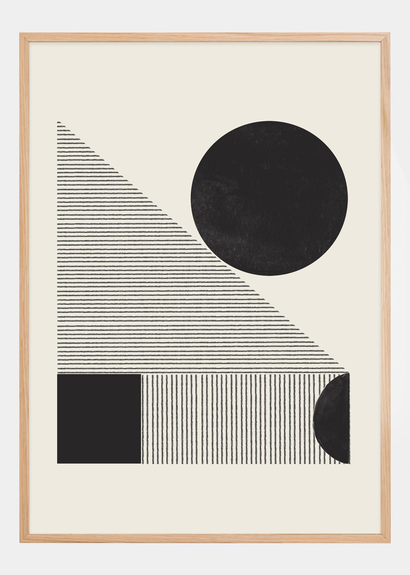 Tento plagát je hravá a sofistikovaná interpretácia geometrickej abstrakcie. Čierne a biele čiary sa prelínajú v starostlivo vyváženom vzore tvarov, zatiaľ čo veľký čierny kruh dominuje hornej časti kompozície a vytvára silný vizuálny kotviaci bod. Kontrastná hra medzi plnými čiernymi oblasťami a bielymi čiarami vyzýva diváka, aby preskúmal rôzne textúry a hĺbky obrazu.