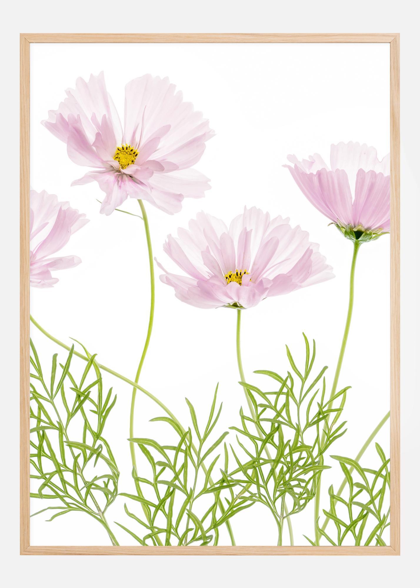 Plagát v tlačovom štýle s kosmeou. Každý kvet je jemne fialovo-ružový so svetložltým stredom. Jednoduché zelené listy vedú pohľad nahor k týmto tancujúcim kvetom. Získajte rozmarný pocit s pomocou tejto úžasnej potlače vo vašom dome.