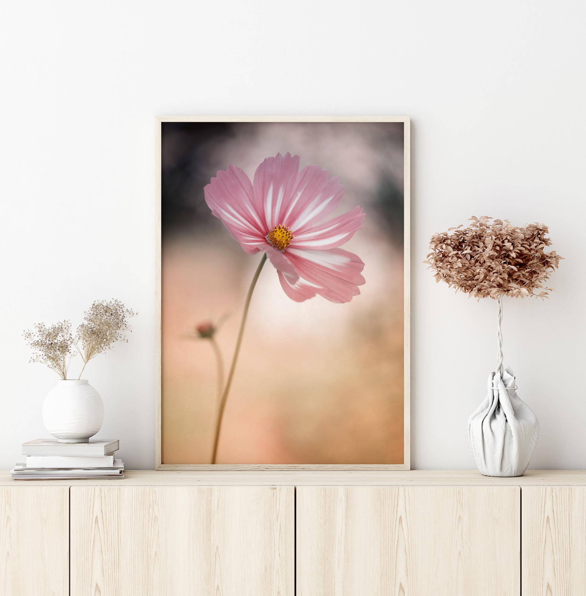 Fantastický plagát s kosmosom s svetlom, ktoré prechádza cez lupene. Ružové lupene a žltý stred sú svetlé s broskyňovým pozadím, ktoré pridáva hĺbku. Pocíťte svetlo a vánok, keď sa pozriete na tento jemný pastelový obraz visaci vo vašom dome.