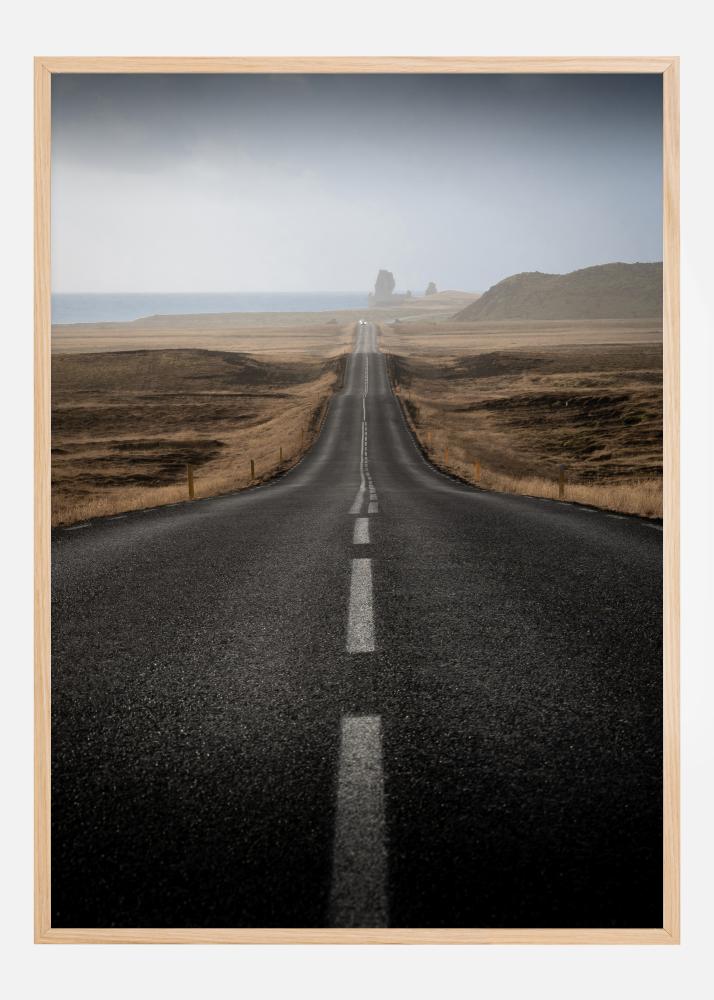 Krajinný plagát s cestou, ktorá vedie po vzdialenom vidieku. Asfaltová cesta sa stráca v diaľke a biele čiary označujú cestu. Po oboch stranách sú hnedé polia a vidíte more a kopce v diaľke. Fantazírujte o tom, kam vás cesta môže zaviesť, keď tento obraz visí na stene.
