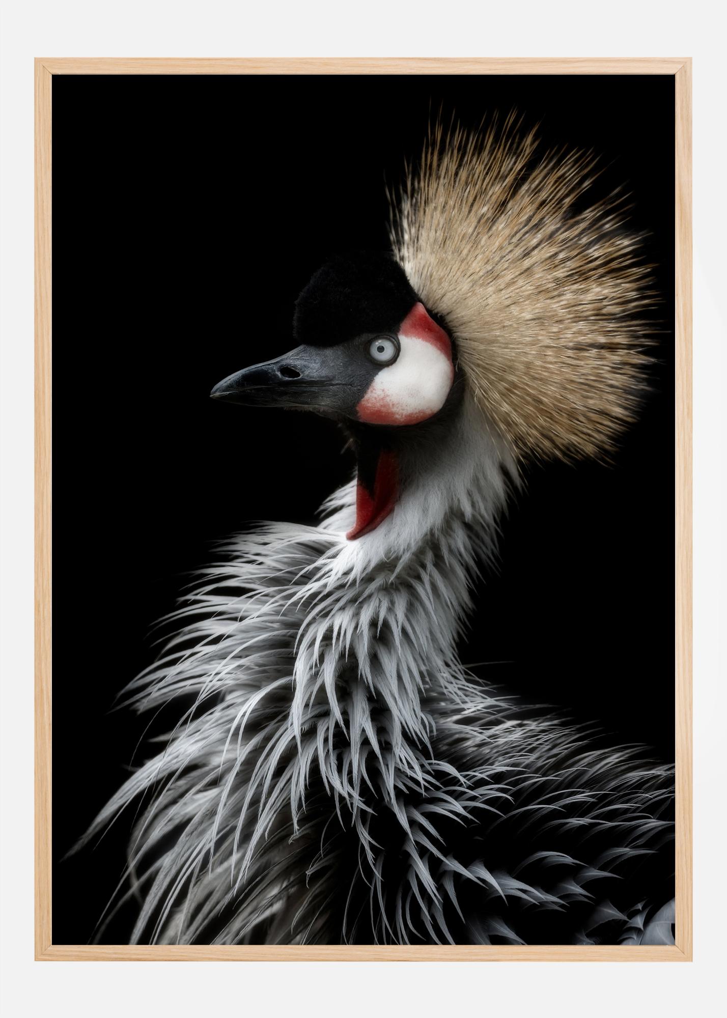 Úžasný plagát divočiny s žeriavom na čiernom pozadí. Biely perie a nadýchaný žltý chochol dramaticky vystupujú a vytvárajú kráľovský efekt. Červené a biele vzory smerujú pohľad k oku vtáka. Obdivujte, aká je príroda veľkolepá, pomocou tohto úžasného portrétu vtákov.