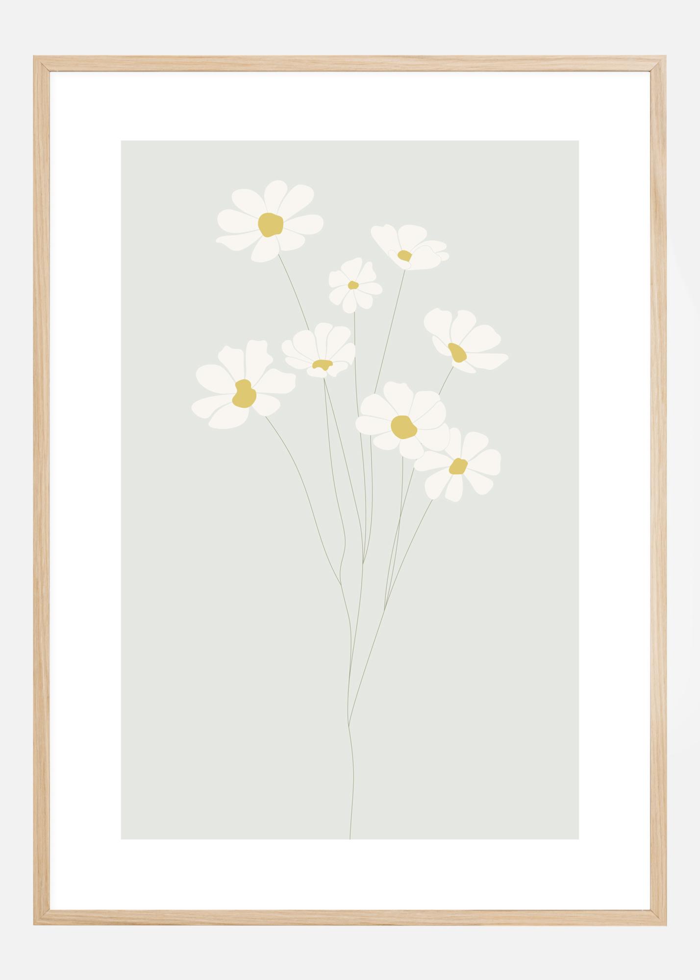 Jemný poster s potlačou sedmokrásky s jemným vzhľadom. Jednoduché biele a žlté kvety sa ťahajú nahor na tenkých stonkách na jemnom bledomodrom pozadí. Zaveste tento obraz do detskej izby pre upokojujúcu, ale sladkú atmosféru.