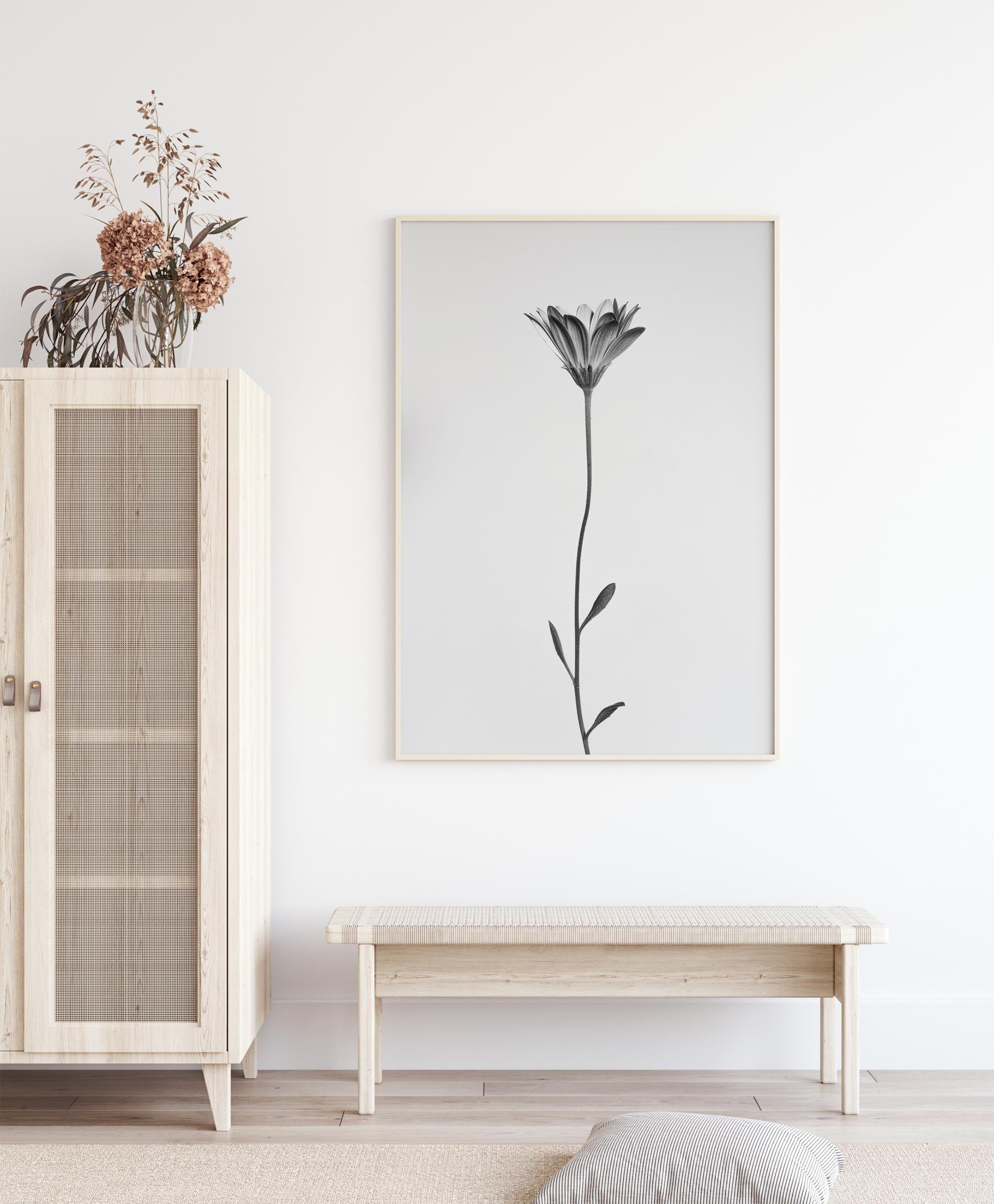 Plagát s detailným záberom na dlhú sedmokrásku na čisto bielom pozadí. Jednoduchá elegancia kvetu je dokonalým doplnkom do vašej minimalistickej kúpeľne alebo kuchyne.