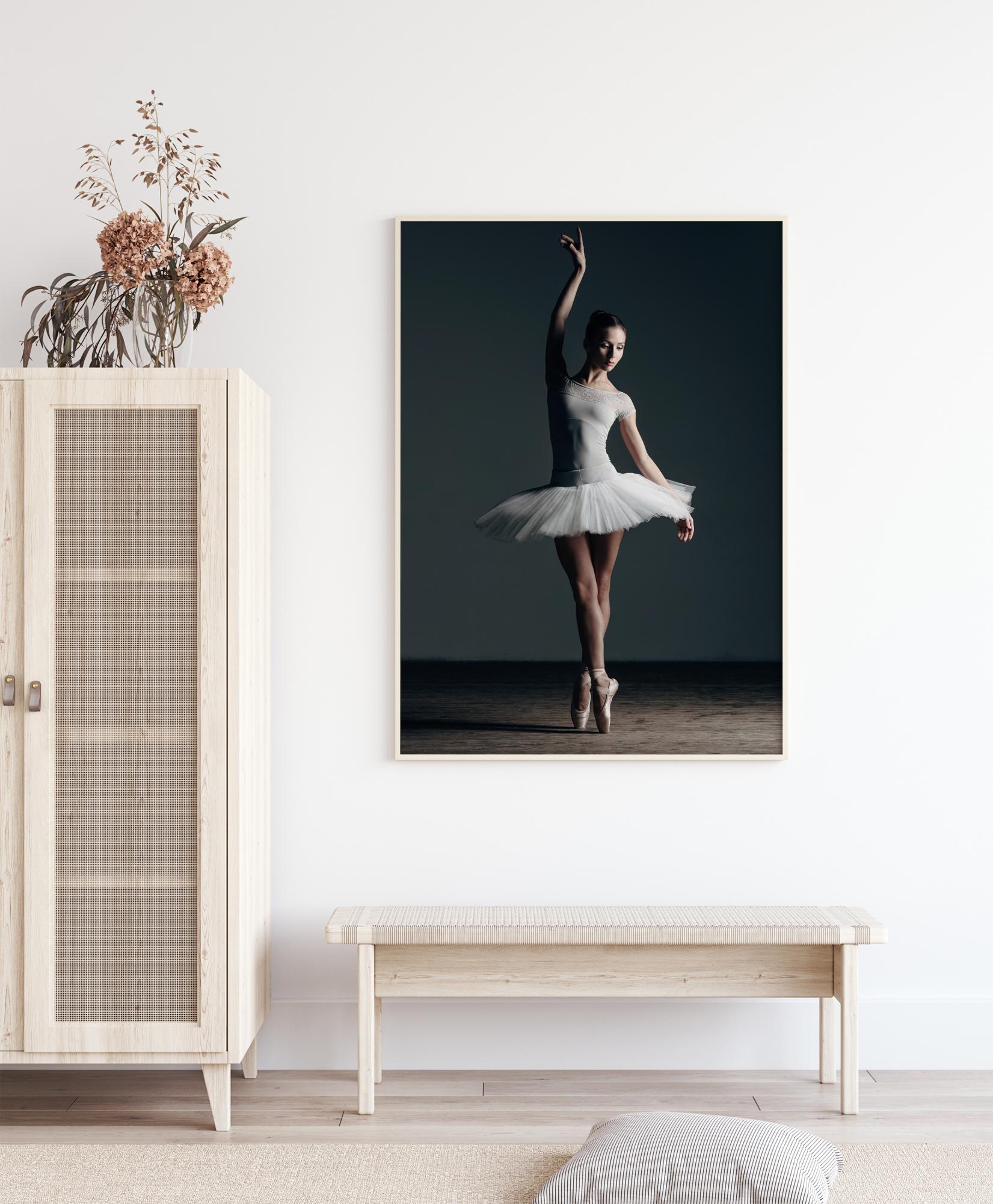 Fotografický plagát pôvabnej baletky stojacej na špičkách s jednou rukou natiahnutou nad hlavu. Osvetlenie na obrázku vytvára pekný kontrast medzi jej tvárou, bielym oblečením a mierne tmavším prostredím