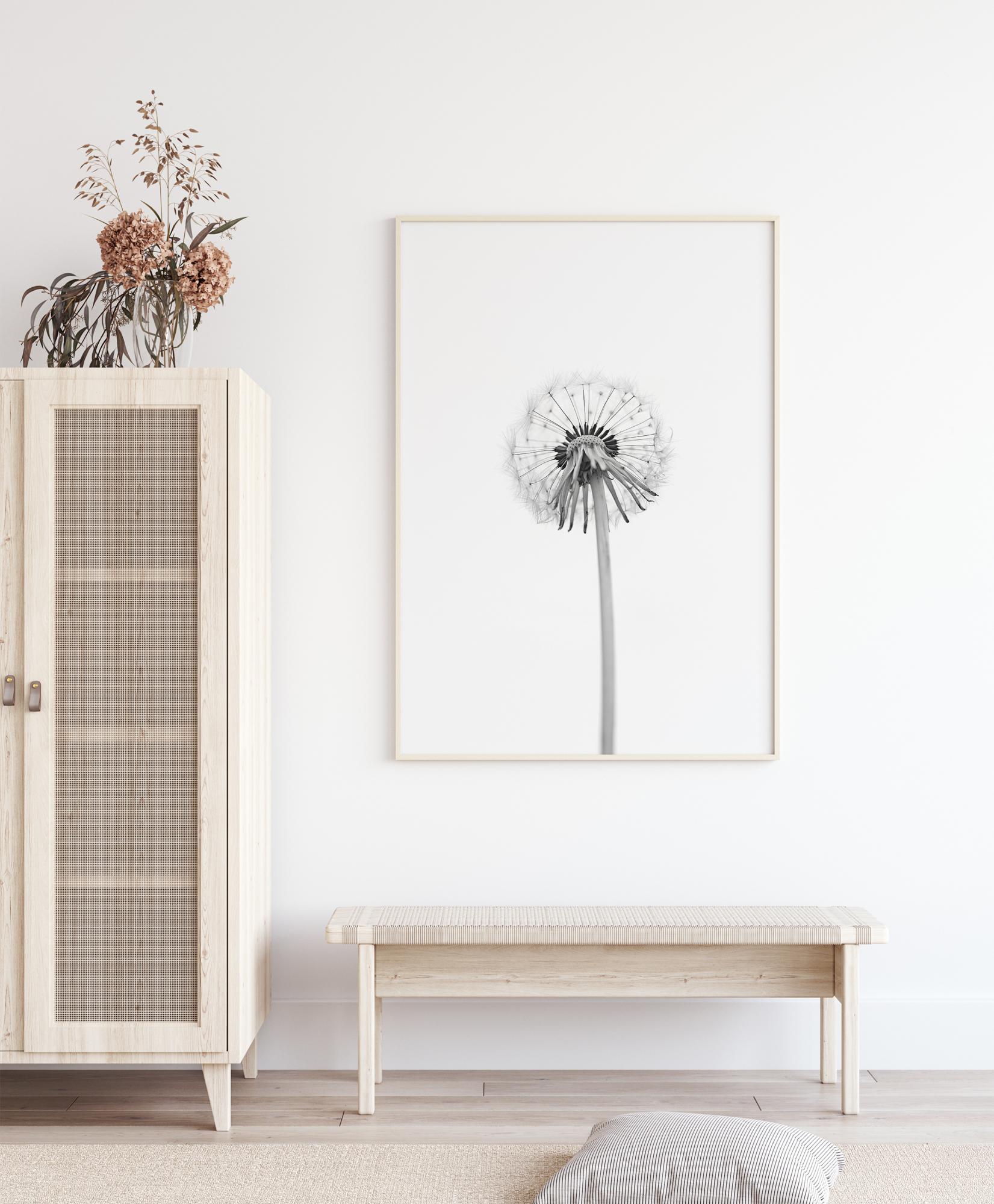 Svetlý, čistý prírodný plagát s púpavou na bielom pozadí. Tento prevažne biely obrázok sa bude vynímať proti živo modrej alebo zelenej stene. Tento obrázok je ideálny pre galériovú stenu.