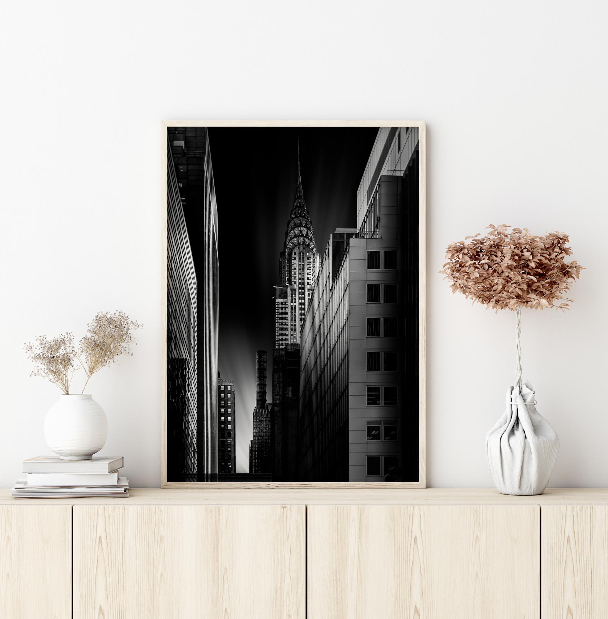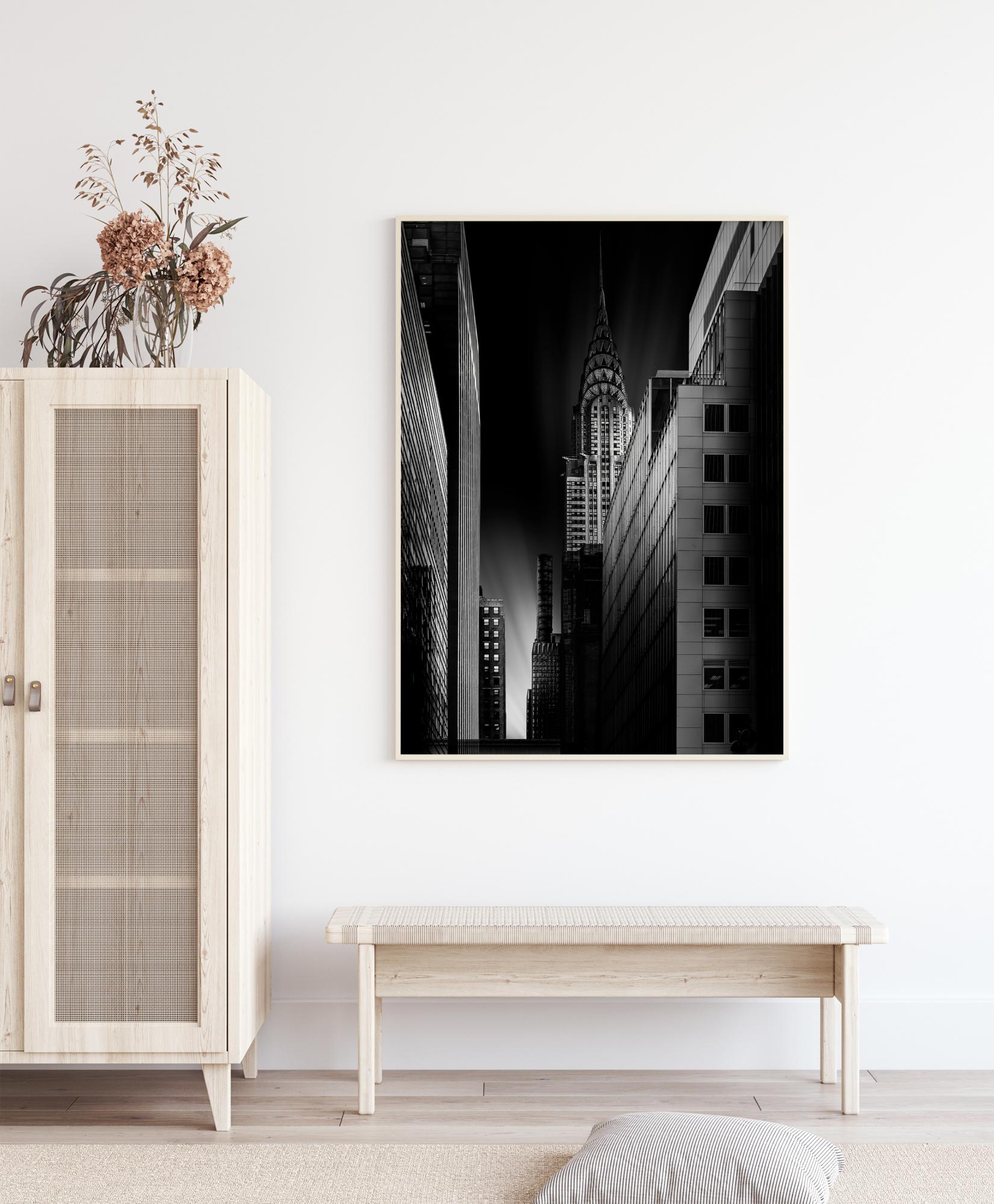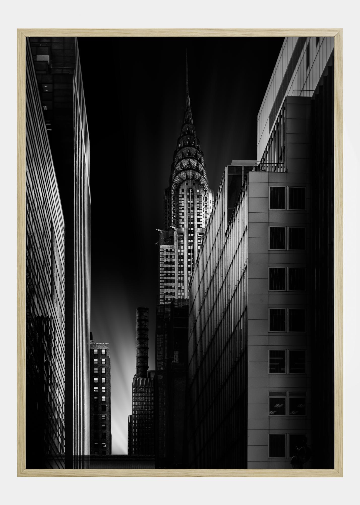 Mestský plagát so stavbou Chrysleru v noci. Úzka ulica vedie pohľad dole k záblesku svetla na oblohe. Na pravej strane je na tejto trochu desivej fotografii vidieť zatienenú budovu. Závesný obrázok na bielej stene v súkromnej galérii.
