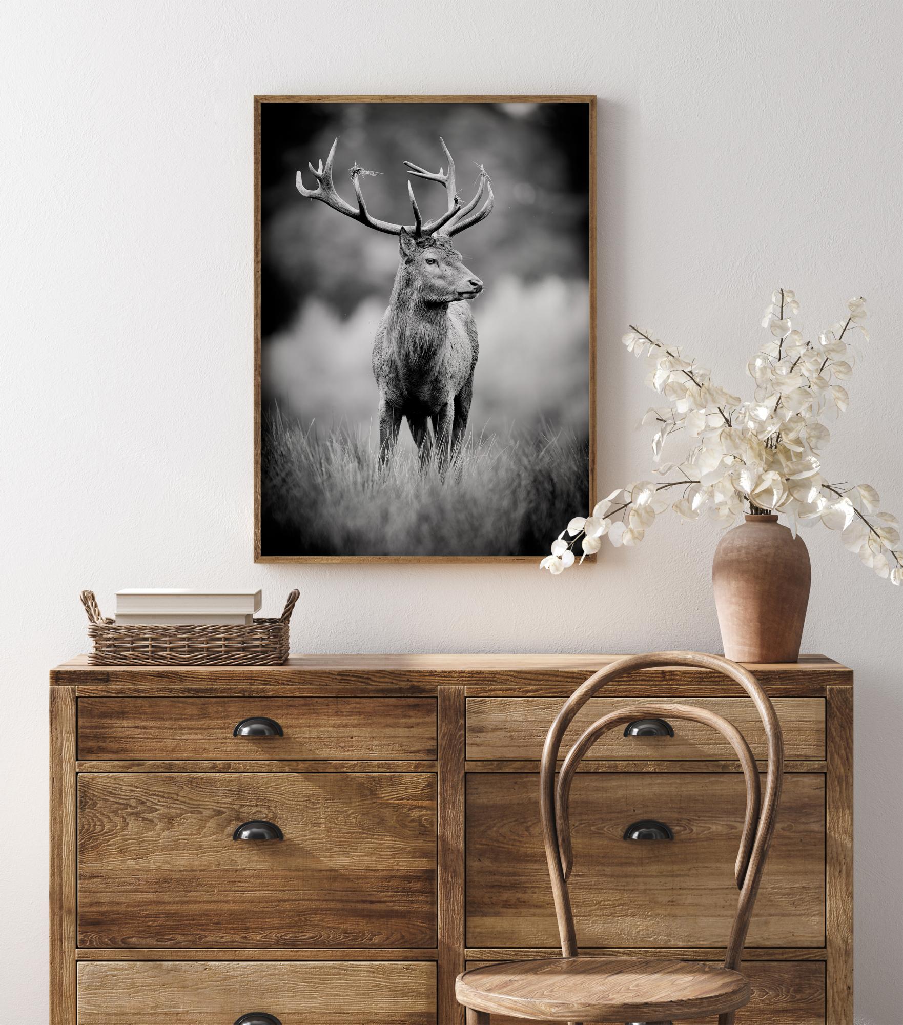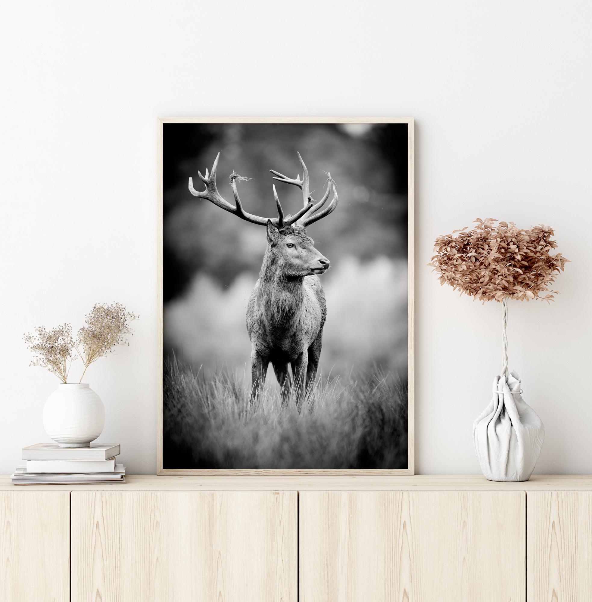 Plagát divočiny s jeleňom v čierno-bielej farbe. Vinetácia vytvára dojem, že sa na neho pozeráte cez ďalekohľad z diaľky, ako by ste to robili v divočine, čo robí túto scénu ešte viac špeciálnou. Jeho hlava je otočená k vám a váš stretnutý pohľad vás očaruje, aby ste sa na neho pozreli ešte dlhšie.