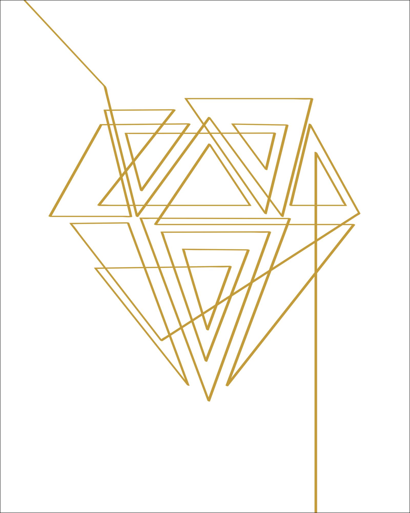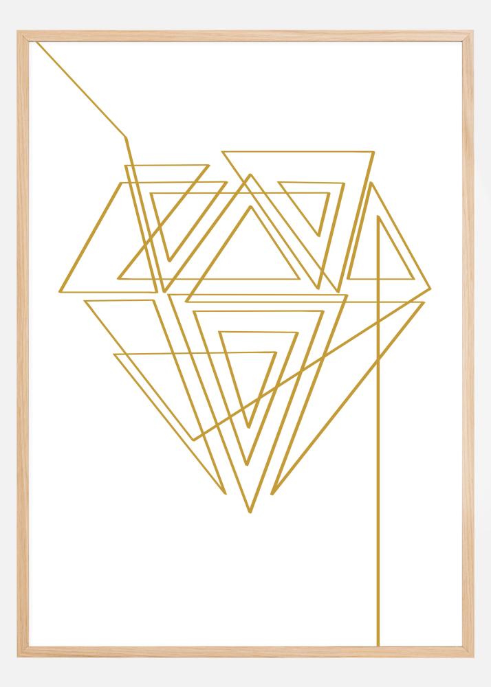 Abstraktný plagát s diamantom zo zlatých geometrických čiar. Tento diamant je zložito vytvorený z rôznych trojuholníkových tvarov v dlhej, neprerušenej línii. Sledujte líniu a zistite, či dokážete rozlúštiť celý vzor. Dielo je urobené na bielom pozadí, takže najlepšie sa hodí na stene krémovej alebo zlatej farby.