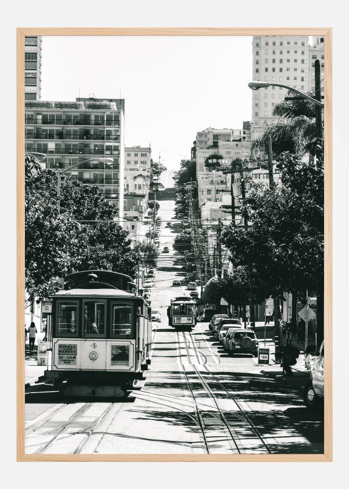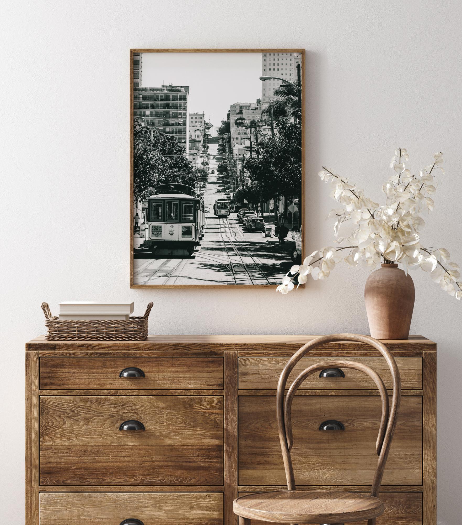 Mestská obrazová tlač s centrom San Francisca. Električka ide hore kopcom medzi domami v popredí so stromami na oboch stranách. Táto čiernobiela tlač pridáva dotyk elegancie bez ohľadu na to, na ktorú stenu sa ju rozhodnete zavesiť.