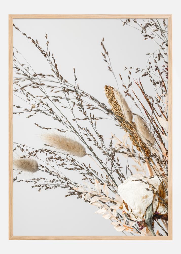 Tento plagát je oslavou tichej elegancie prírody, ktorá zobrazuje rôznorodé usporiadanie sušených rastlín. Prirodzená kompozícia je plná jemných línií a organických tvarov, od vlniaceho sa trávnika po robustné klasy a jemne tónované listy. Paleta hnedo-béžových sušených rastlín na čisto bielom pozadí prináša pocit tepla a prírody, ktorú zachytáva v stíšení.