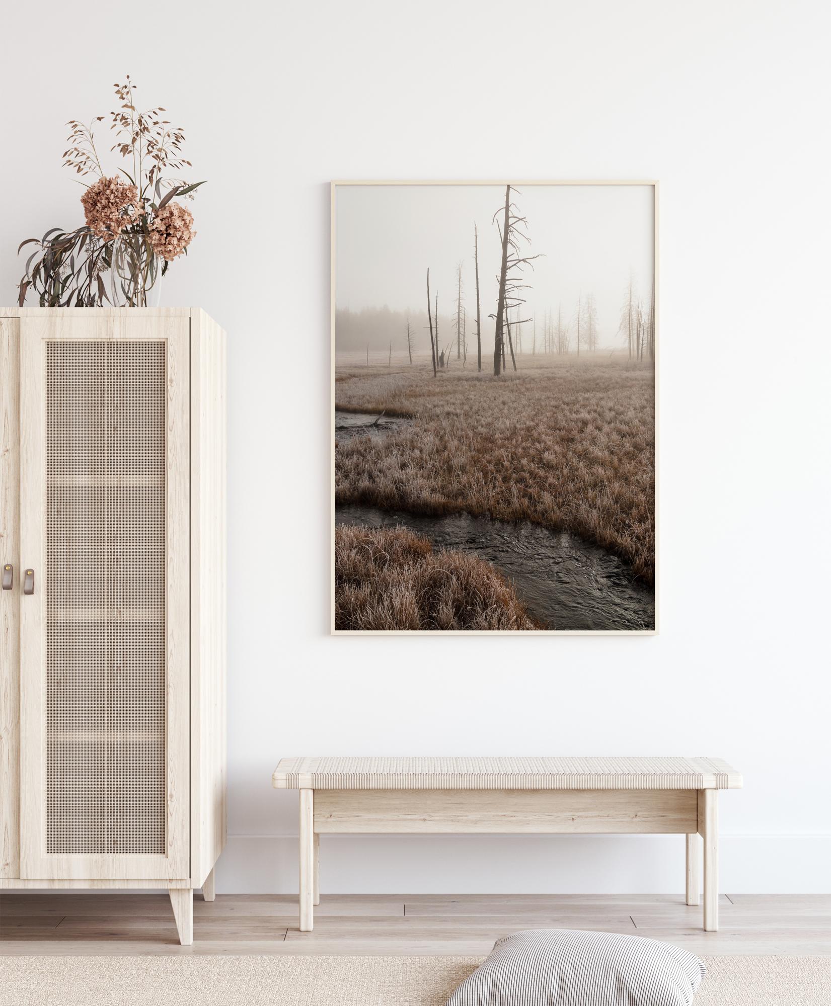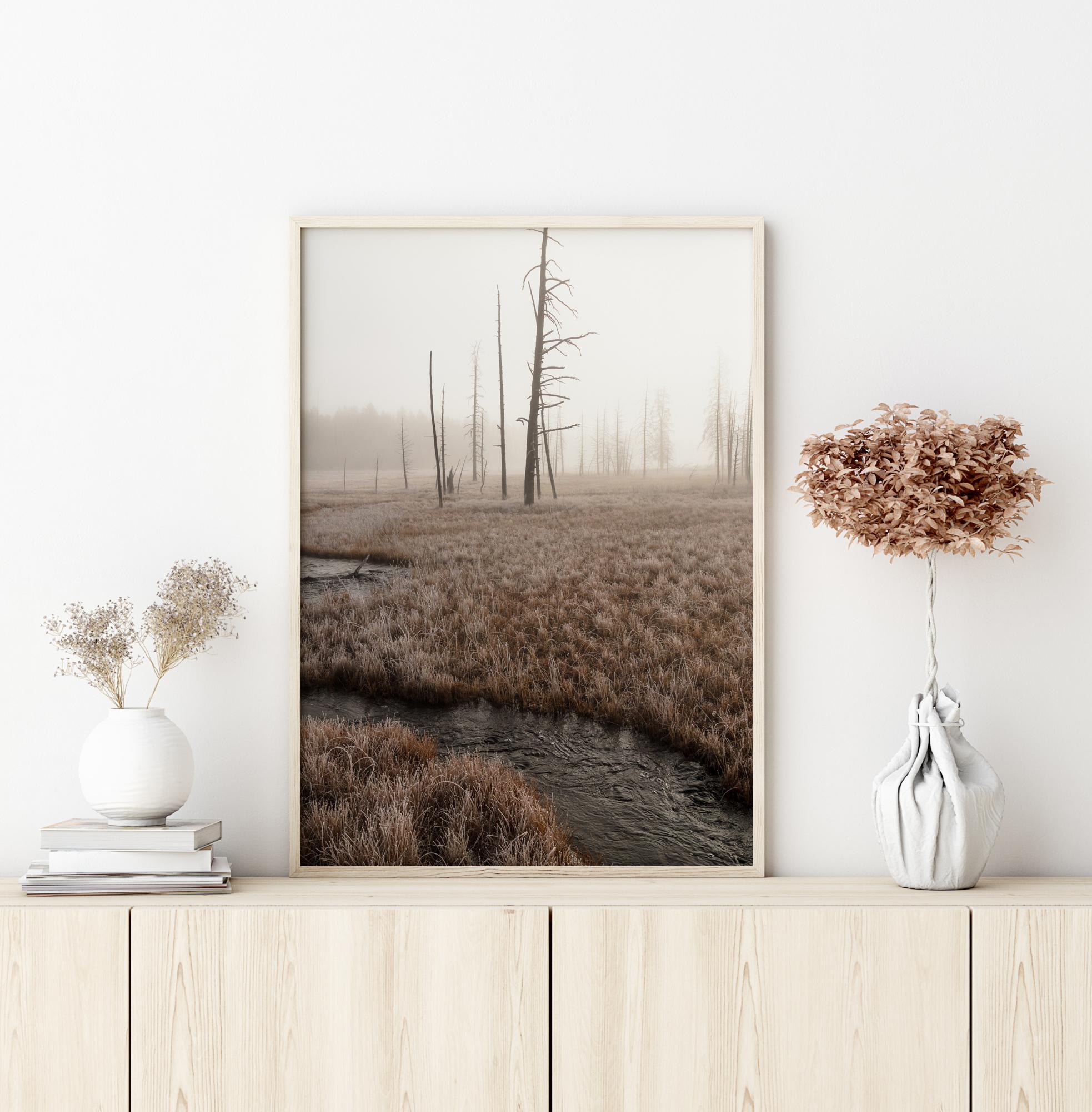 Nadpozemský plagát krajiny s planinou s mŕtvymi stromami a riekou, ktorá cez ňu preteká. Na tejto rannej fotografii stromy a žltá tráva zahŕňa hmla. Sledujte rieku, ako sa vlní krajinou až k vzdialenému lesu. Stratte sa v inom čase a priestore, keď ho zavesíte.