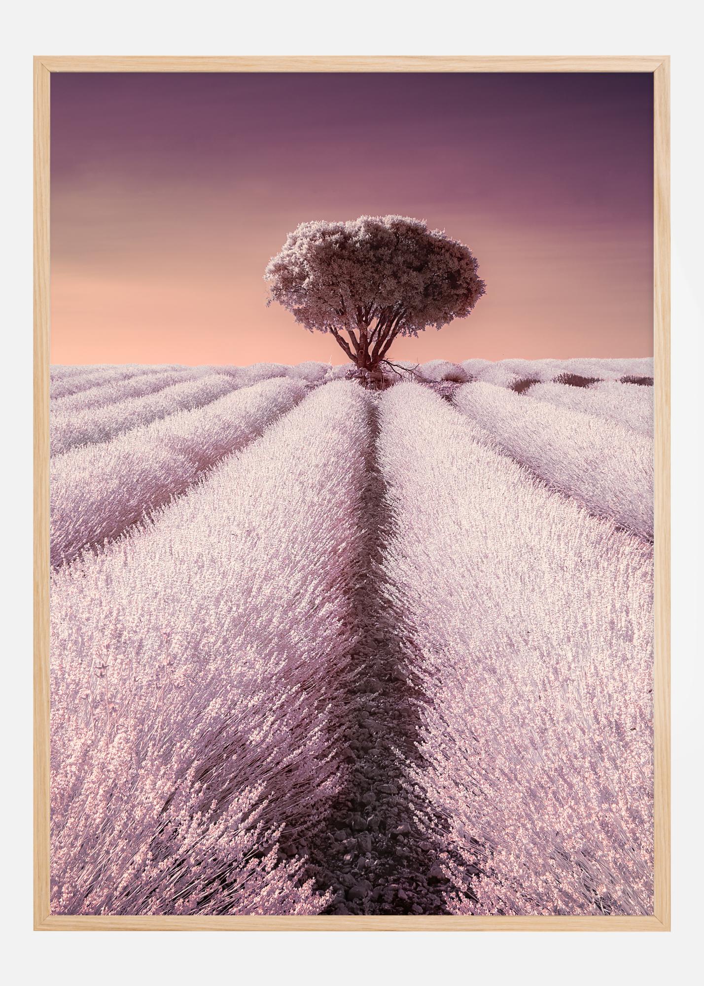 Vstúpte do sveta snov plného farieb a fantázie s našim exkluzívnym plagátom. Tento výtlačok vyžaruje magický dojem svojou pastelovou oblohou, ktorá prechádza z teplých ružových do upokojujúcich fialových odtieňov. Motív zvýrazňuje osamelý strom, majestátne vystredený pozdĺž čistej línie cesty cez levanduľové pole. Tento plagát je vizuálnym pôžitkom pre oči a dokonale by sa hodil ako ústredný obraz v akejkoľvek miestnosti, pričom pridáva nádych pokoja a krásy.