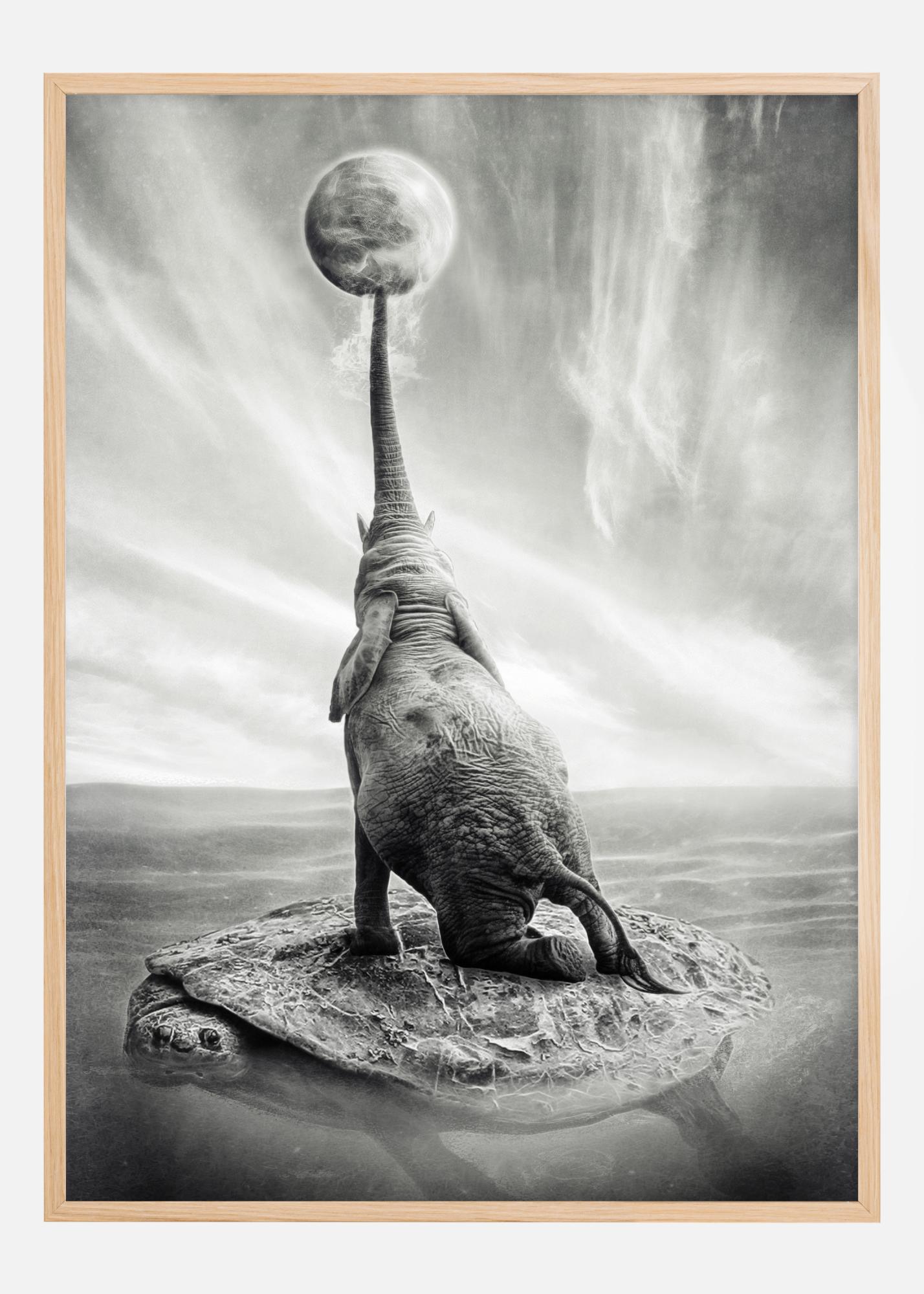 Táto fascinujúca čiernobiela poster zachytáva surrealistický obraz slona, ktorý stojí na korytnačke a balansuje svetovú guľu na svojom chobote. Obraz vyžaruje mocnú symboliku a hrá sa s prvkami mytológie a fantázie. Texturovaná pokožka slona a korytnačky, detailná a výrazná, dodáva dielu takmer hmatovú dimenziu, zatiaľ čo rozmazané pozadie oblakov a krajiny prispieva k snovej a etickej atmosfére.