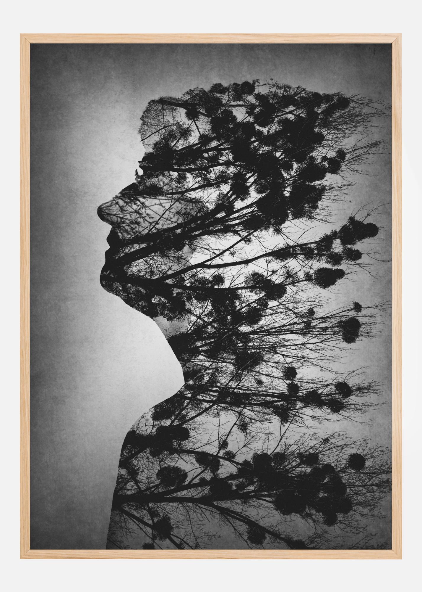 Abstraktný plagát s tvárou ženy, vytvorený pomocou rôznych listov a vetvičiek. V úžasnej čiernobielej farbe, táto dramatická póza spôsobuje, že máte pocit, akoby vietor fúkal tieto listy cez jej tvár. Silné zadné osvetlenie zvýrazňuje profil, ktorý dáva tejto kompozícii silný, ale transparentný pocit.