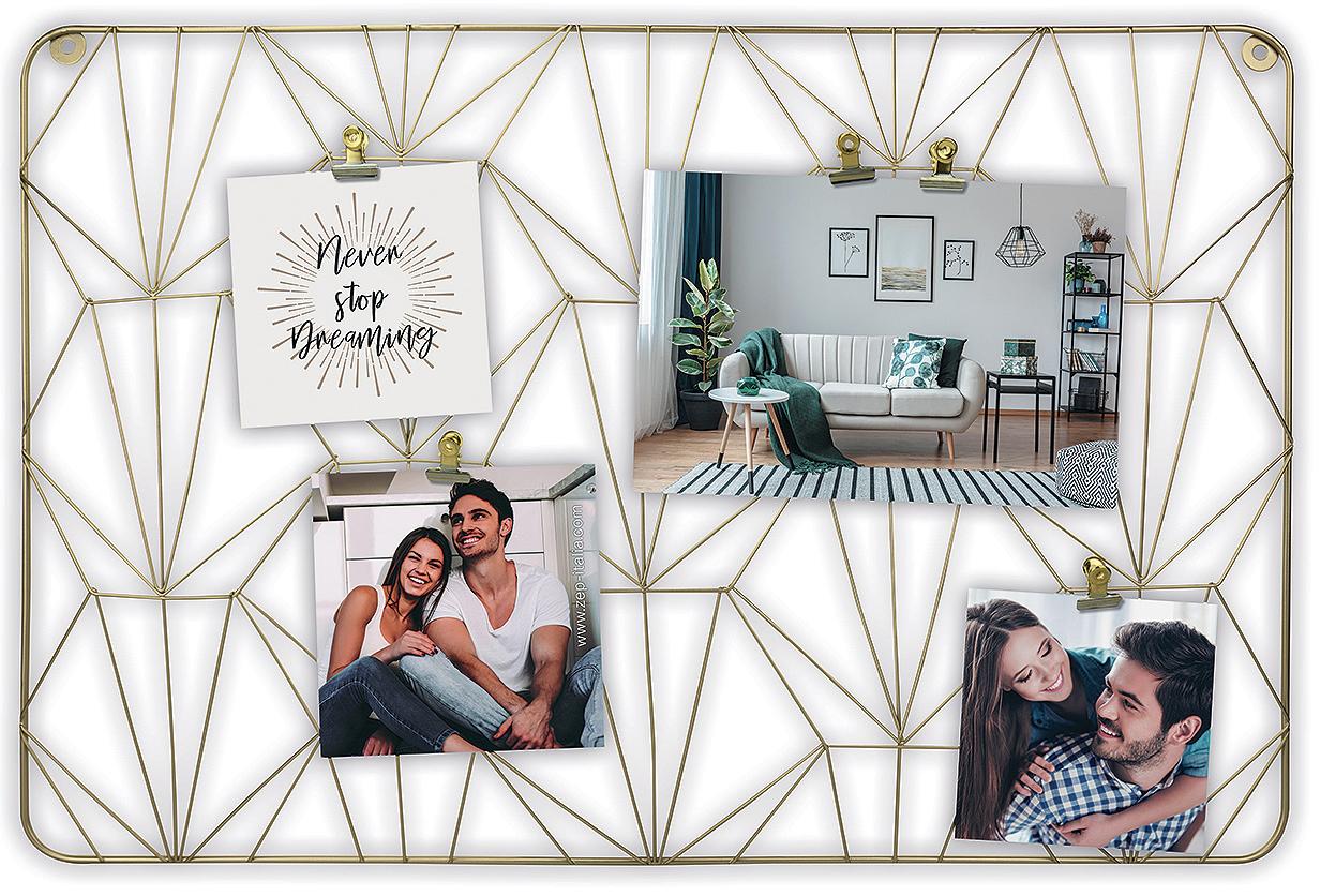 Kolážový rám navrhnutý ako nástenka, na ktorú pripevníte svoje fotografie pomocou klipov. Rám je vyrobený z kovu a má zlatý odtieň. Pretože si svoje obrázky pripevňujete sami, môžete sa rozhodnúť miešať fotografie rôznych veľkostí a tiež využiť svoju kreativitu a pripevniť napríklad menšie plagáty alebo pekné poznámky! Rám má vonkajšie rozmery 62x41 cm. Tento rám sa hodí najmä nad pracovný stôl, do kuchyne alebo niekde inde, kde vynikne jeho dekoratívna a funkčná hodnotnosť. Nástenné upevnenie je k dispozícii.