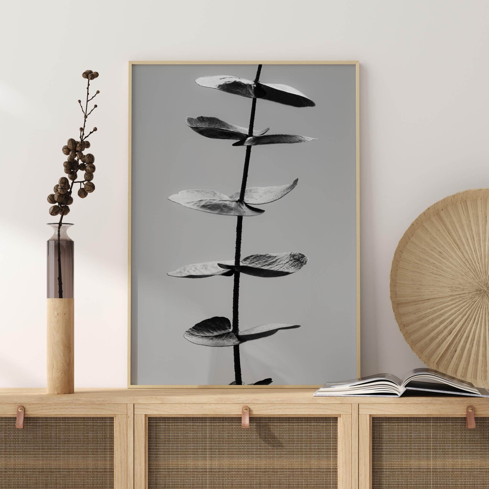 Jednoduchý prírodný plagát rastúcej vetvy eukalyptu. Elegantná čierna a biela v tomto minimalistickom diele sa bude dobre hodiť a bude mať upokojujúci efekt v zelenej miestnosti so srdečným slnečným svetlom.