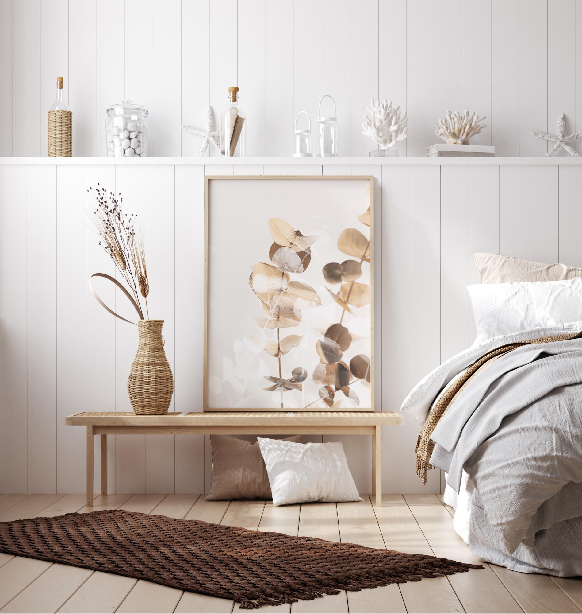 Zlatý plagát s listami a vetvami eukalyptu. Zlaté a hnedé listy vynikajú v lesklej podobe na jednoduchej bielej pozadí. Na zvýraznenie týchto listov skombinujte s podobnou zlatou alebo tmavokrémovou stenou pre extra eleganciu.