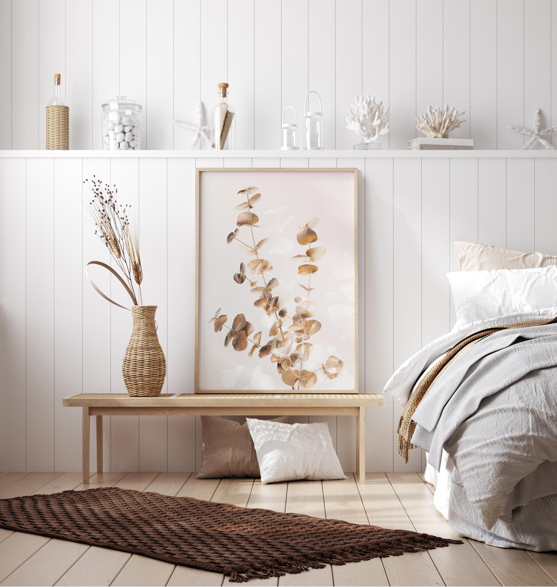 Úžasný plagát s vetvičkami zlatého eukalyptu. Zlaté a hnedé listy sú jemné tam, kde vyčnievajú z bieleho pozadia. Listy sú okrúhle, čo v obraze vytvára pekné tvary. Tento plagát prináša do vášho domova pokojný a štýlový pocit.